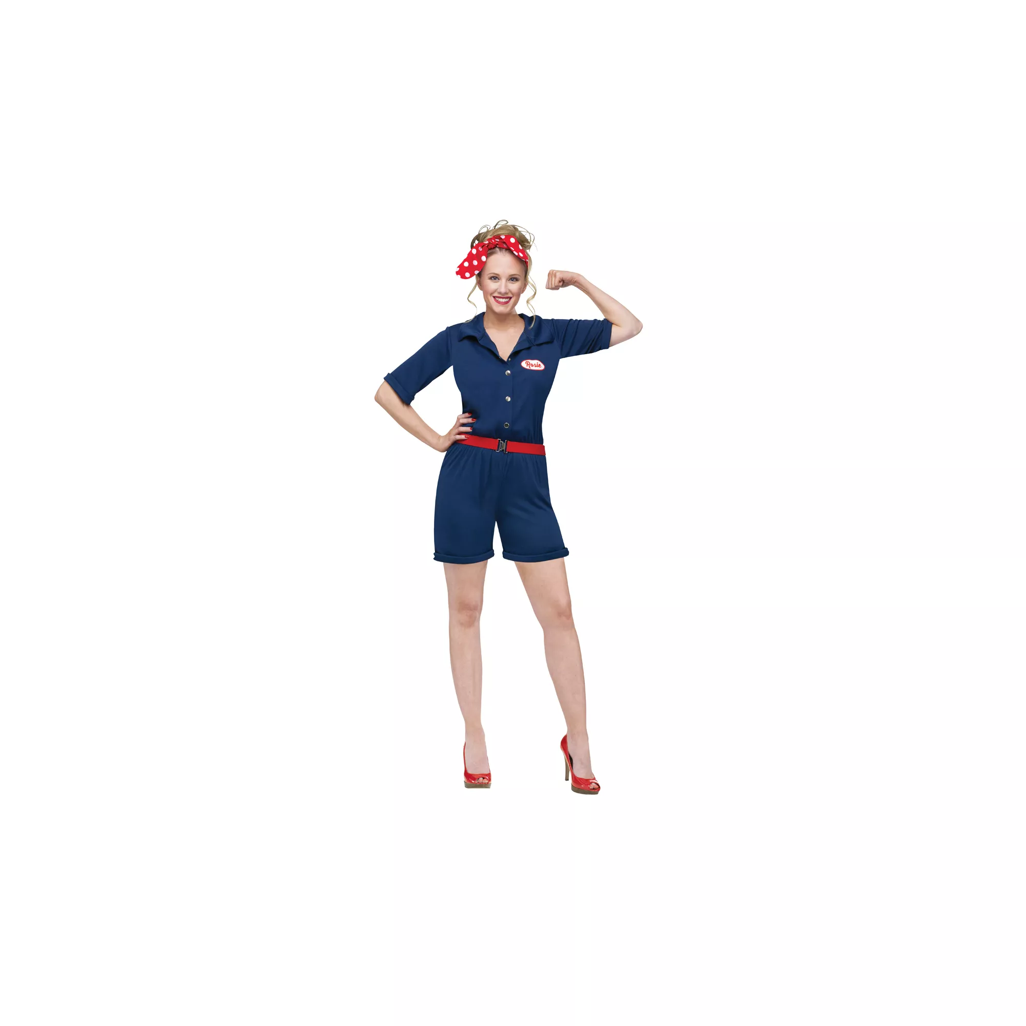 Be an iconic poster woman this Halloween in the Classic Rosie the Riveter Adult Women's Costume. You can do anything you set your mind to in this blue romper with patch, belt and polka dot headscarf.