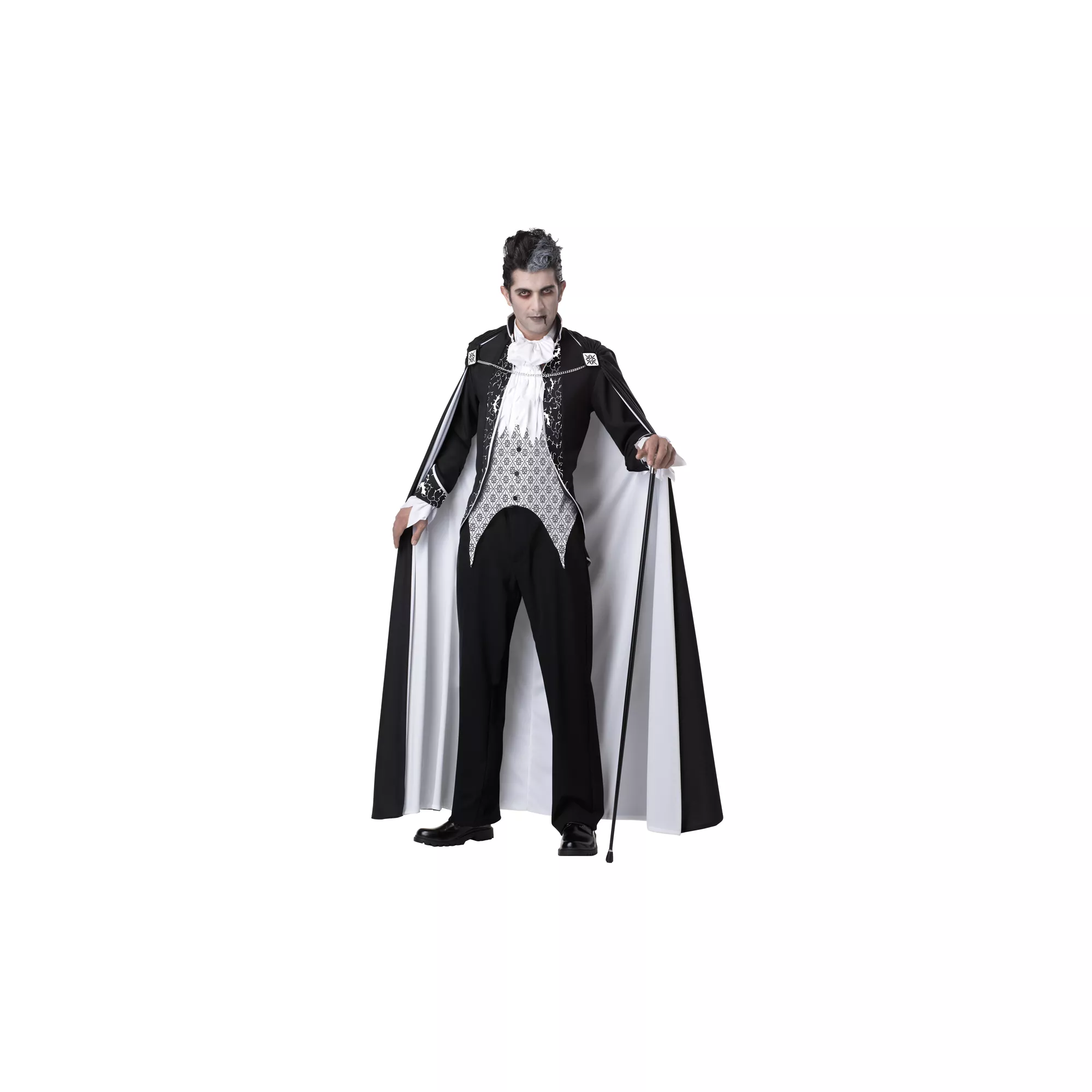 Make your mark on Halloween when you arrive in this handsome black and white adult men's Royal Vampire costume and make it a formal affair. You will look great from twilight to midnight in this elegant costume which includes a cape, two brooches and a chain. Beware of any telltale red lipstick marks on the white cravat!