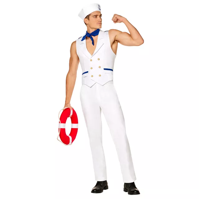 Anchors aweigh! Strut your stuff in style with this adult sailor costume. This form-fitting, nautical ensemble is sure to have you diving into boatloads of fun this Halloween.