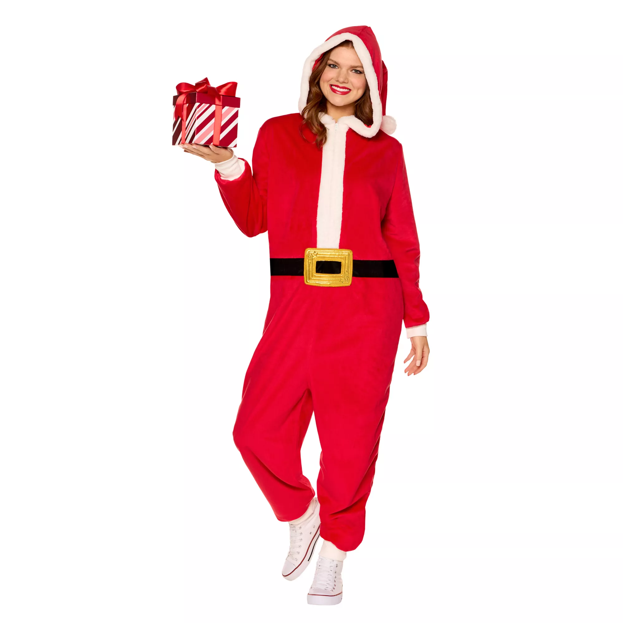 Prepare to dash through the snow in style when you wear this officially licensed Santa Hooded Jumpsuit Costume! Designed to look exactly light Santa's signature outfit, this cozy and easy-to-wear one-piece costume will have you celebrating your favorite holiday all year long.