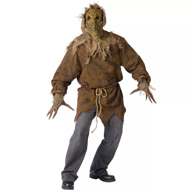 Put the "scare" in Scarecrow when you wear this adult Scarecrow costume that is truly frightening. No birds will roost on your broad shoulders - one look at that face and they're gone like the wind! Add menacing behavior and nasty noises for a spook-tacular Halloween.