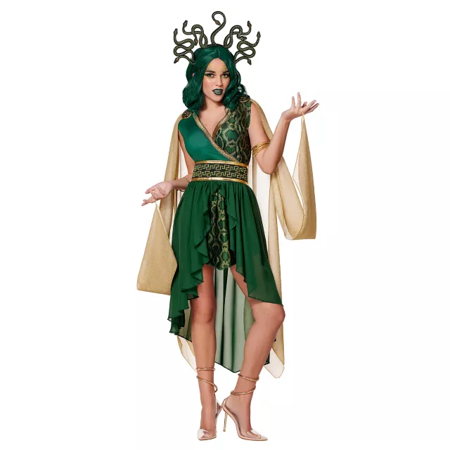 It’s set in stone this Halloween; you’re best dressed! This mesmerizing Serpent Queen costume is the perfect way to keep heads turning. The emerald green dress is paired with a matching belt, snake crown, and 2 snake pins.