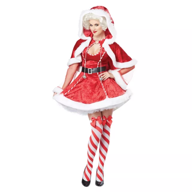 Mrs. Claus is ready to make her appearance on the naughty list in the Sexy Mrs. Claus Adult Women's Costume! Santa might forget his trek around the globe and decide to stay by the fireplace with you when you wear this seductive red dress which features an open keyhole neckline and waist-cinching belt. You'll be sweet as a candy cane with striped trim details and matching bow thigh highs. The alluring and velvety caplette keeps you partially under wraps, but your seasonal sass comes out in this delightful costume!