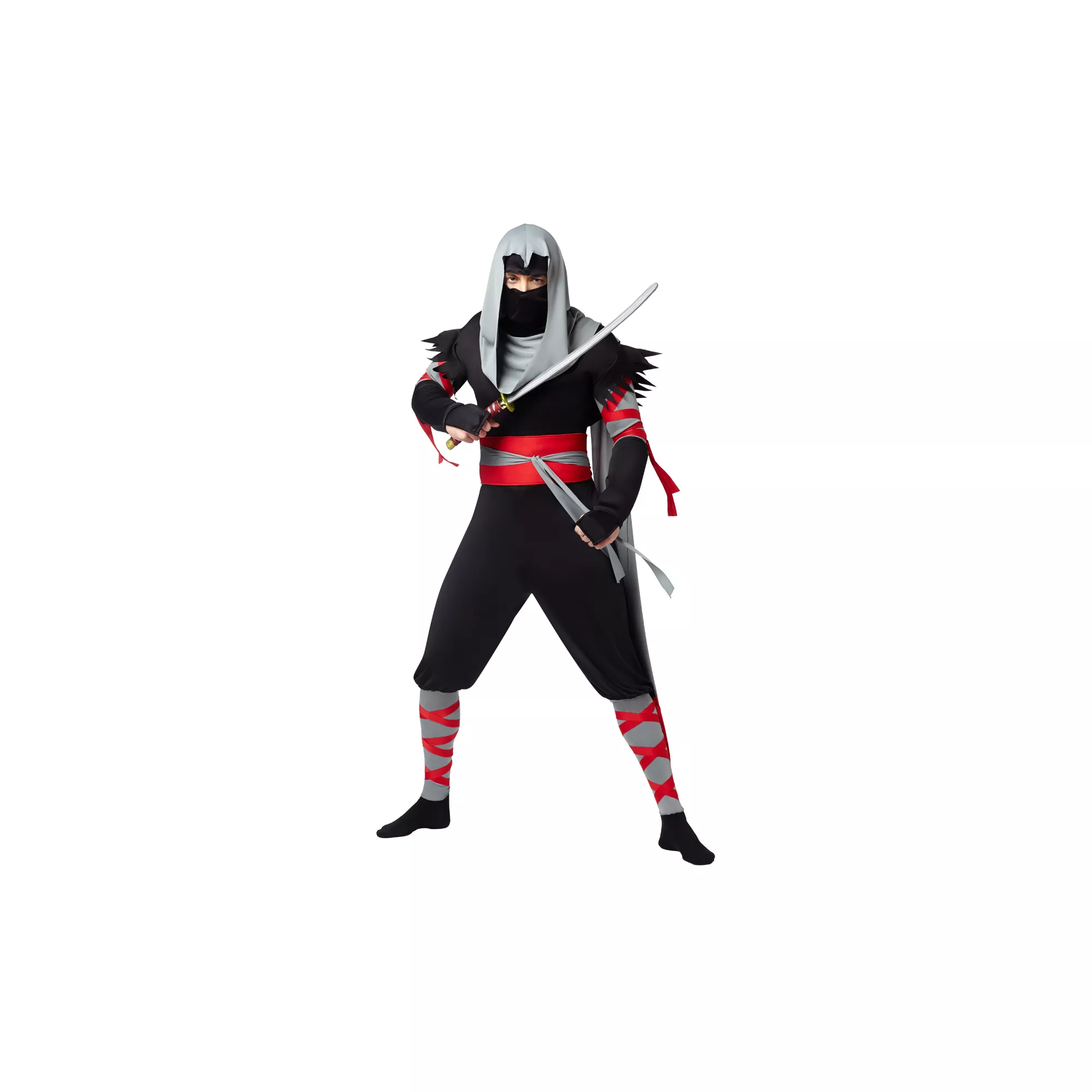 Use all of your stealth skills on Halloween when you wear the Shadow Ninja Adult Men's Costume. This black, grey and red jumpsuit with an attached hood will help you blend into the night and it comes complete with a face mask and belt.