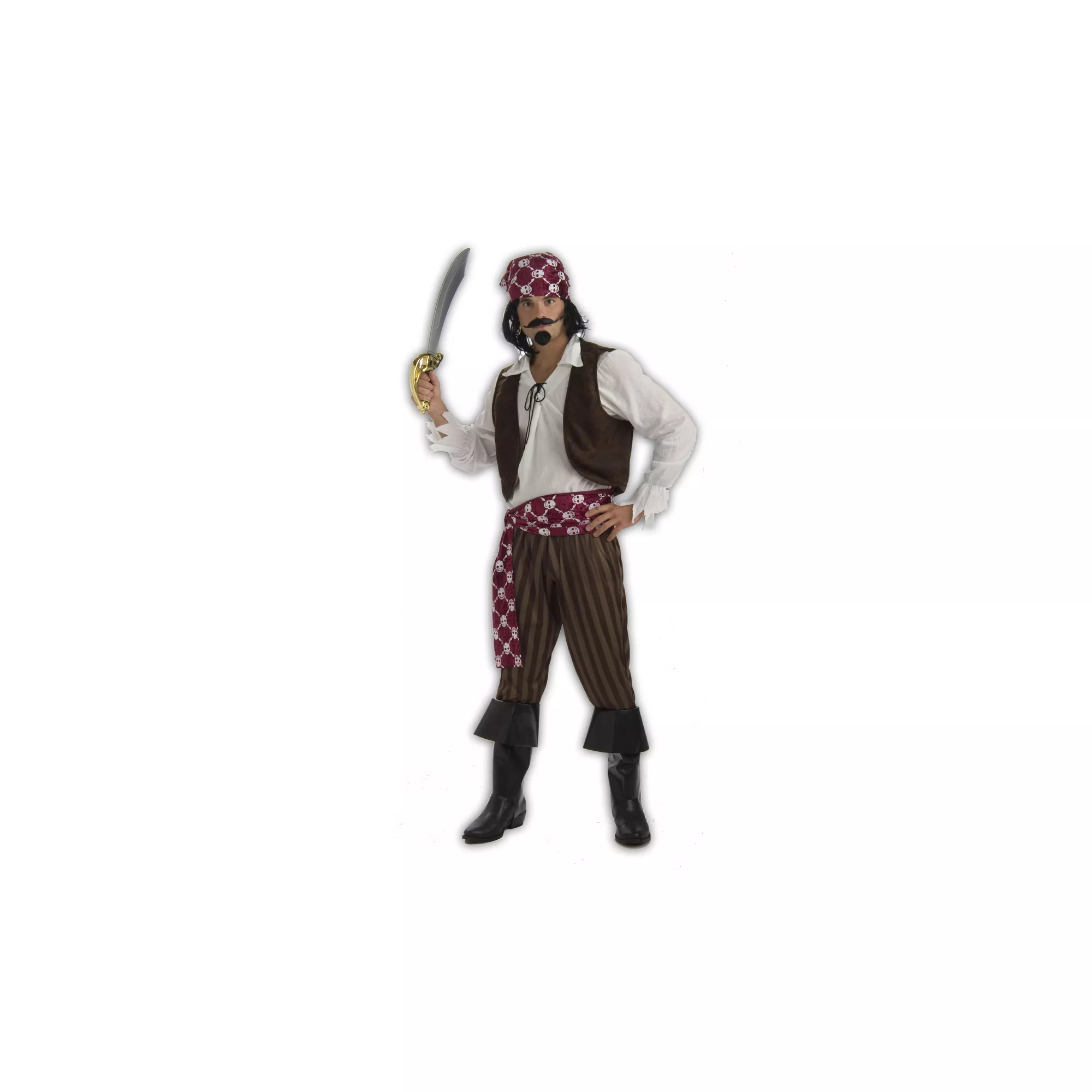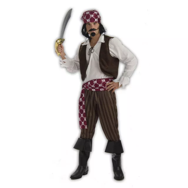 Set sail for a Halloween adventure in this ruggedly handsome Shipwrecked Pirate plus size adult mens costume - it includes a skull and crossbones embellished bandanna and sash - you add the swagger and the bravado.