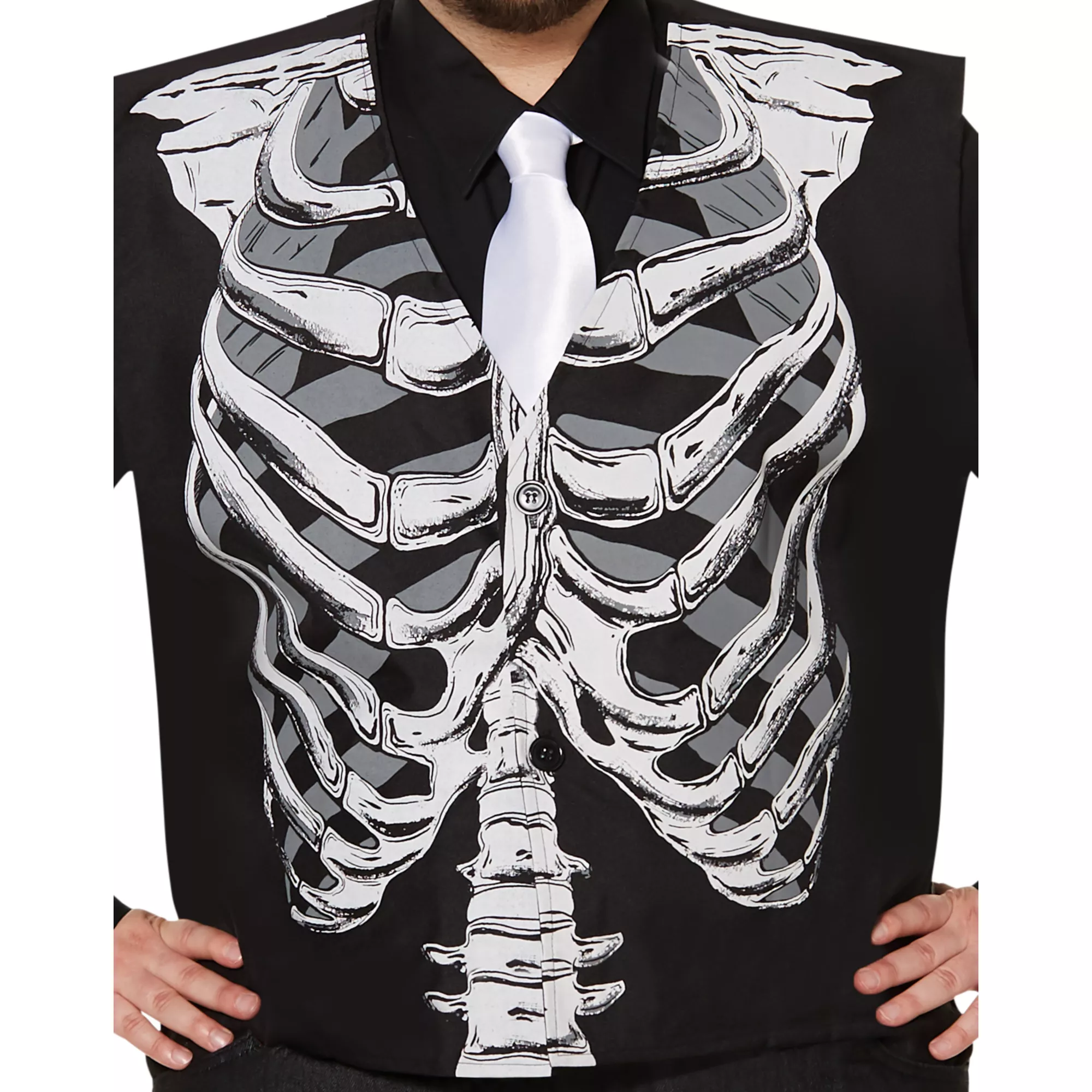 Look even better than you did at your funeral in this Adult Skeleton Vest. Be a gentleman among the other dead in this black vest with white rib cage graphics! Put it over a skeleton costume or a black shirt and add a skeleton mask or makeup (sold separately) to complete the look!