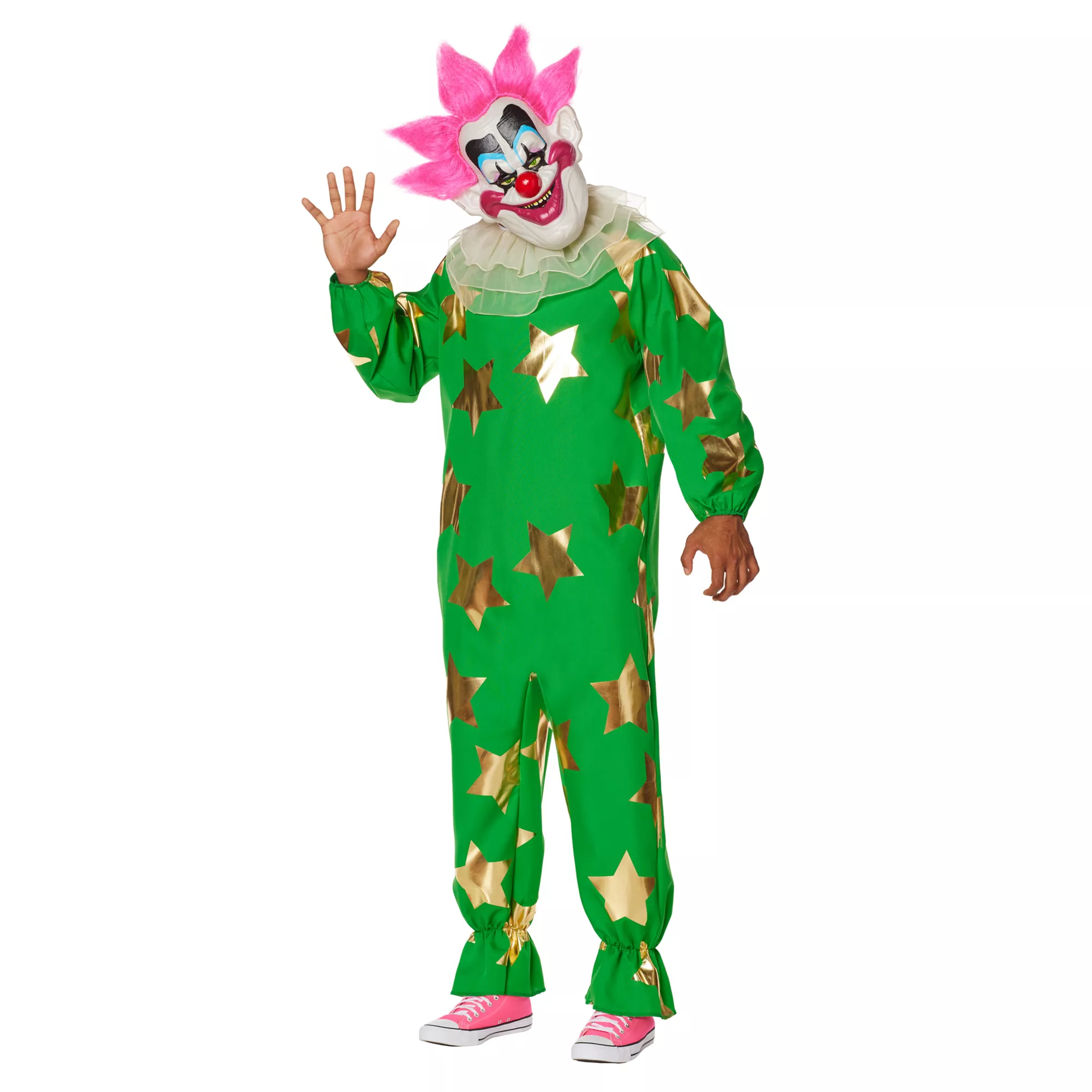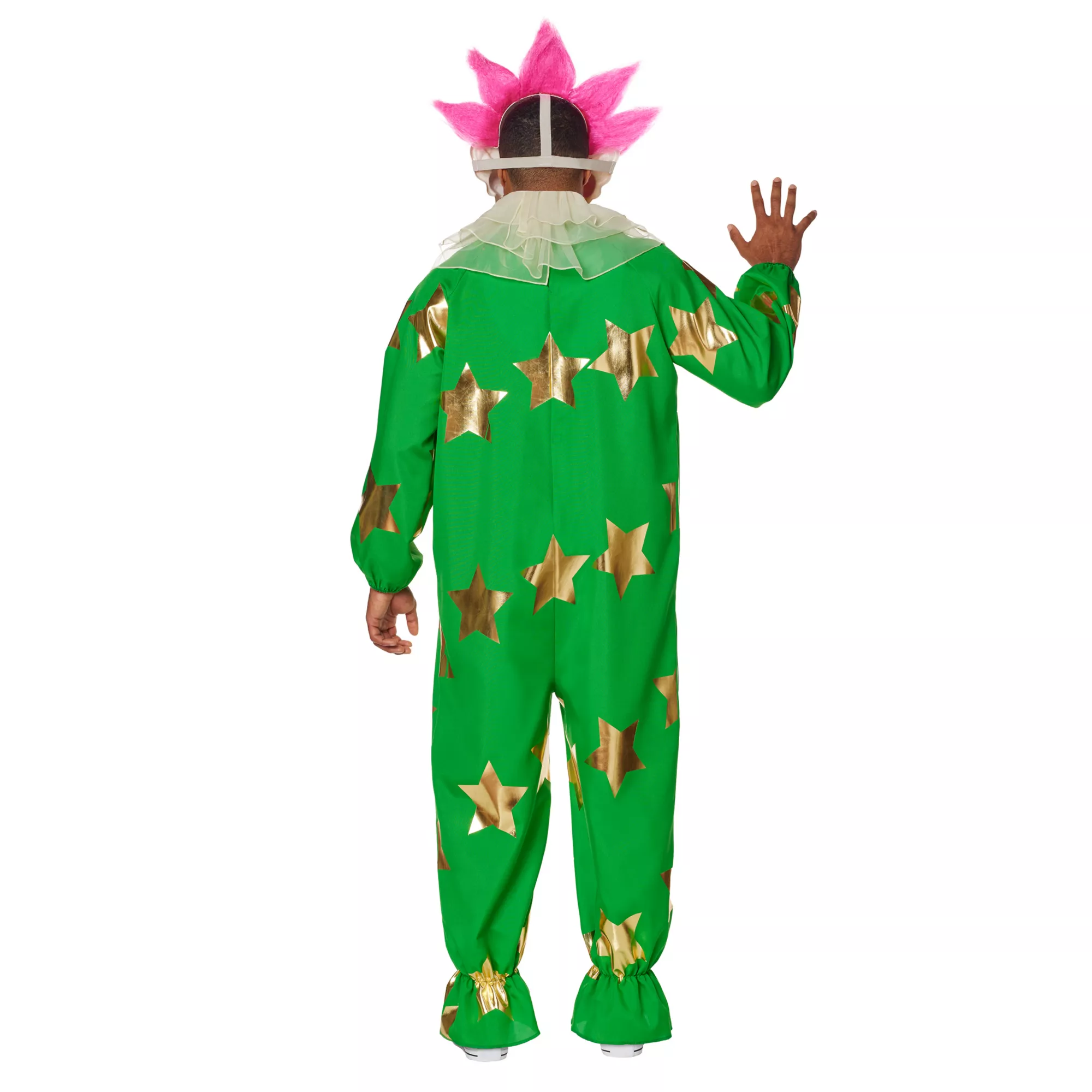 Become the sinister Spikey with this officially licensed Killer Klowns from Outer Space costume. This creepy clown getup includes a green jumpsuit covered in gold stars, a lively clown collar, and a menacing half mask with bright pink hair and a disturbing grin. Hop in the clown car! We're going for a ride.