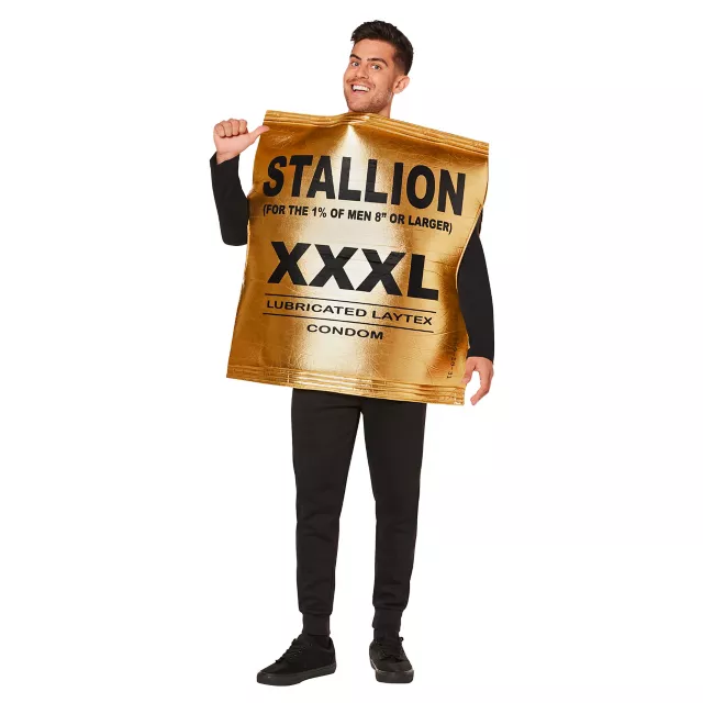 Show off your stallion status in this condom wrapper costume. This funny XXXL condom wrapper costume is made with movement-friendly gold material with bold black graphics.
