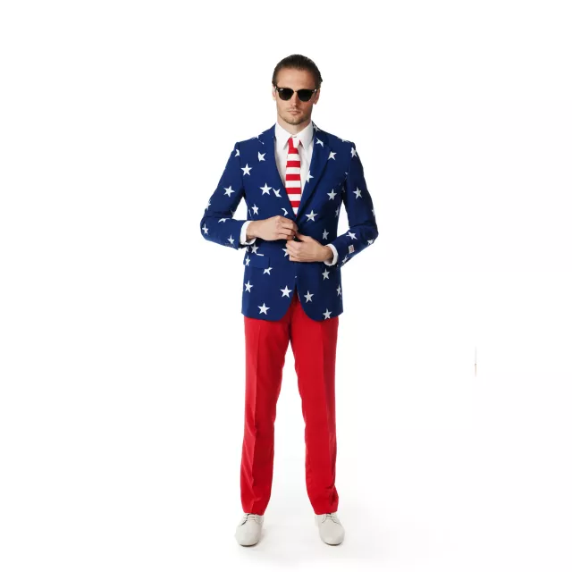 Truly embody the All-American man when you wear the Stars and Stripes Party Suit! Everyone will salute this patriotic suit which features a star-spangled suit jacket, red pants and striped tie. Great for work functions, parties and your political campaign of course, this high-quality suit makes America proud. Pants come with 1.5 inches of extra material at the seam, so they can be perfectly tailored to your body.