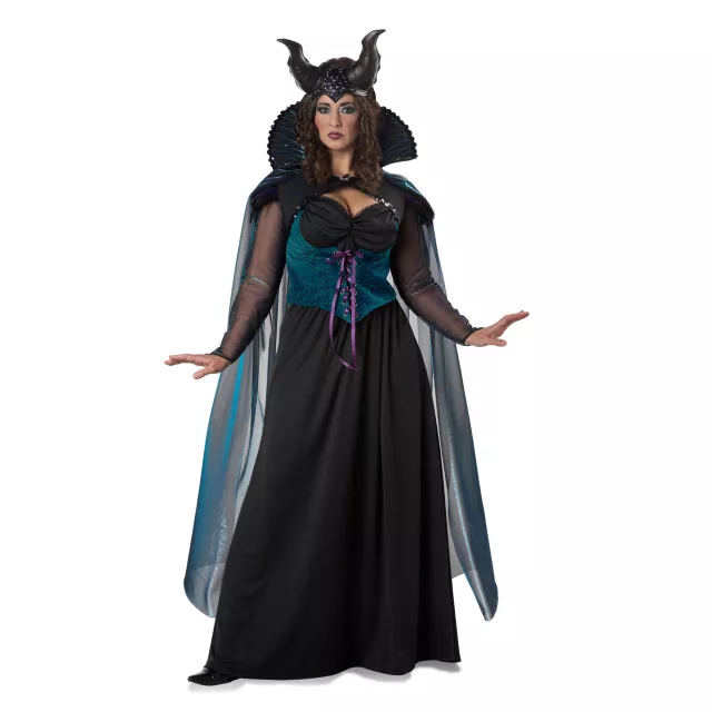 Map out all of your evil plans in the Storybook Sorceress Adult Women's Plus Size Costume and the princesses stand no chance. This multicolored gown features a peacock blue corset with a beautiful violet lace-up bodice, but the magic does not stop there. The cape and shrug attachment features gleaming sequins, a purple gem and glittering cape. Revel in your evilness with the included ornate horned headpiece.