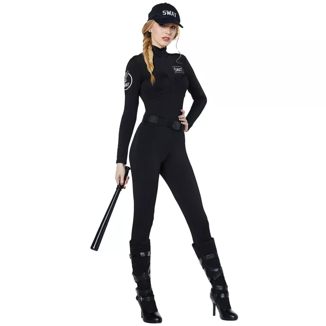 Show everyone who's boss when you rock this sexy and sleek SWAT catsuit costume! Break down doors and keep the neighborhood safe! This sexy one piece costume comes with a belt and a hat for the perfect professional look!