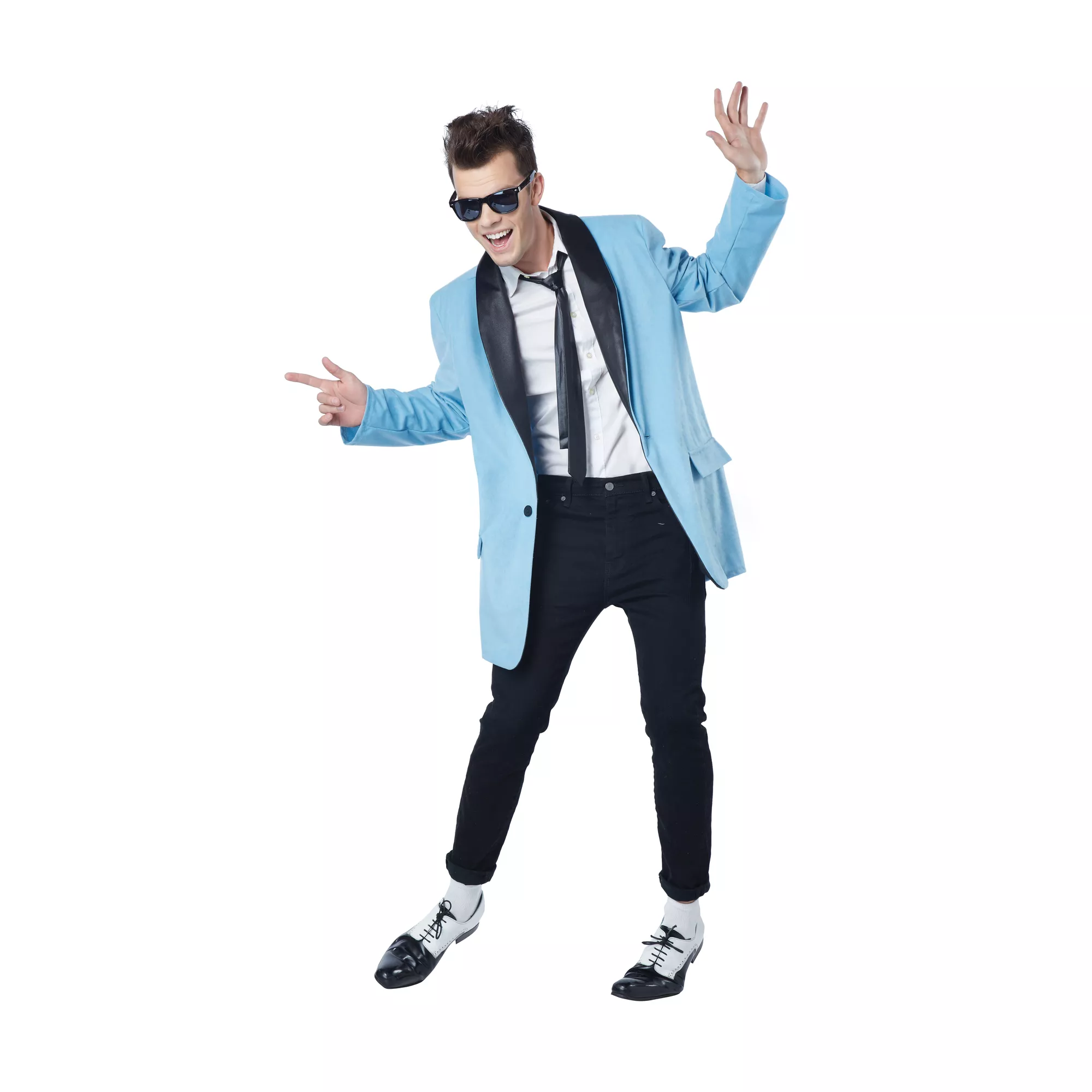 Get ready to show off your talent with the 50's Teen Idol Men's Costume. This costume features a baby blue 50's box coat with screen print and a classic black skinny tie. Just grab some shades to block out the flashing of the cameras and get ready to smile!