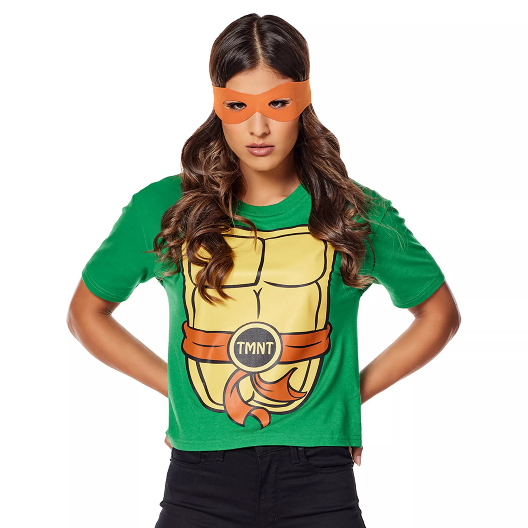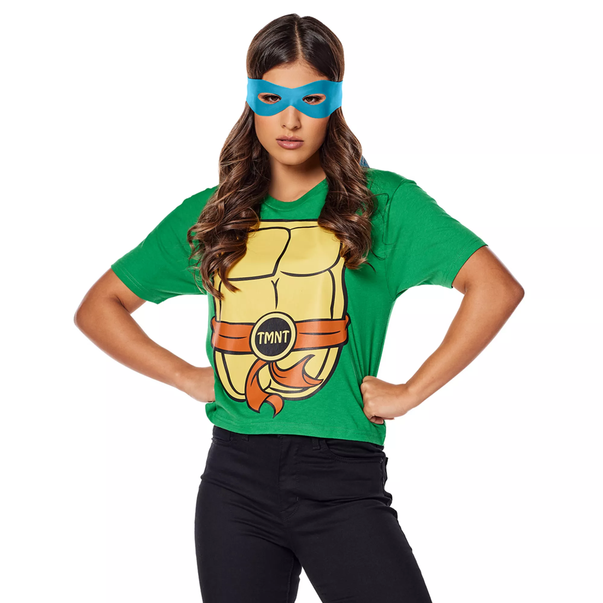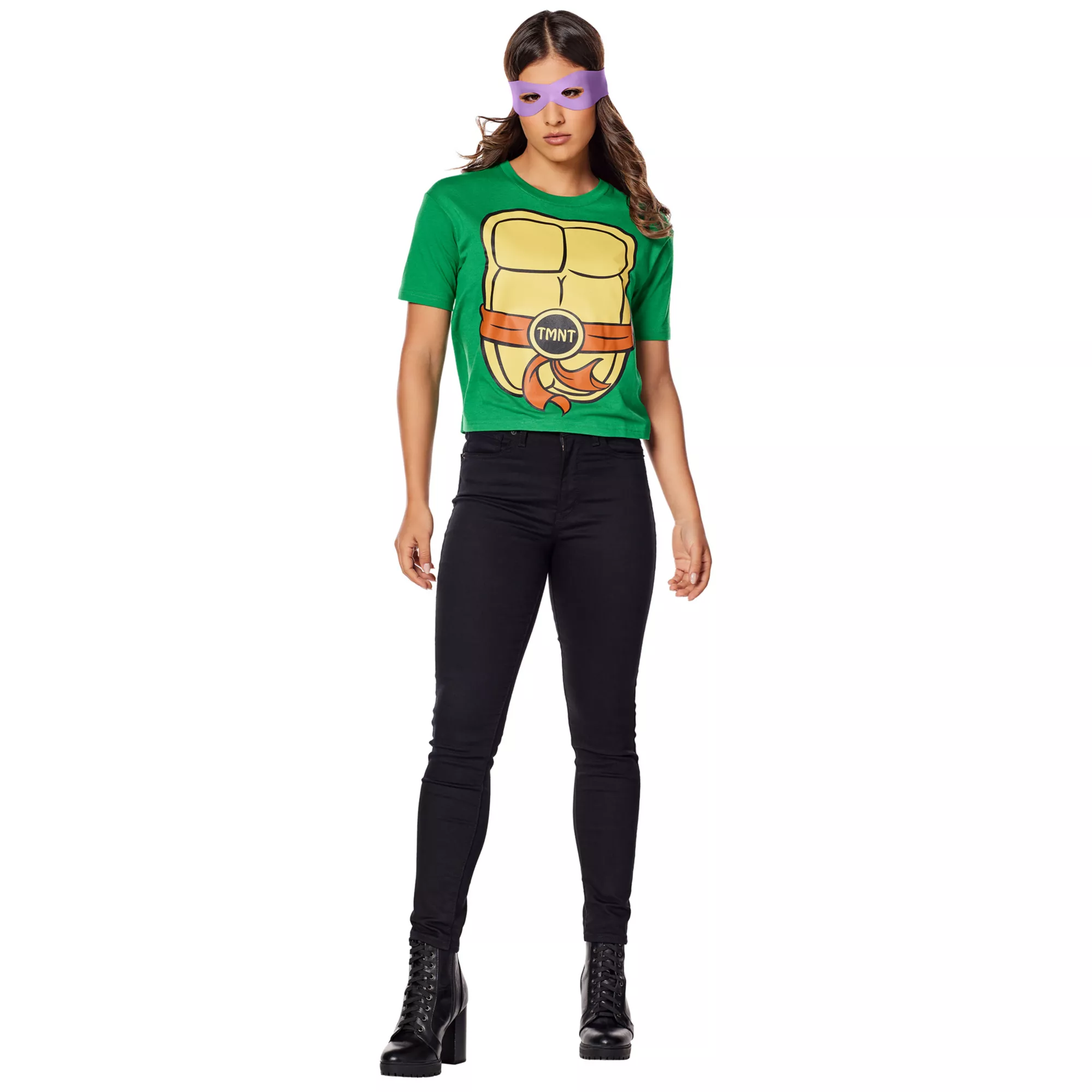 Transform into your favorite pizza-loving turtle with this adult Teenage Mutant Ninja Turtles t shirt costume kit! This costume includes a green t shirt with front and back Ninja Turtle graphics, and 4 eye masks so you can choose whether you want to be Michelangelo, Donatello, Raphael, or Leonardo.