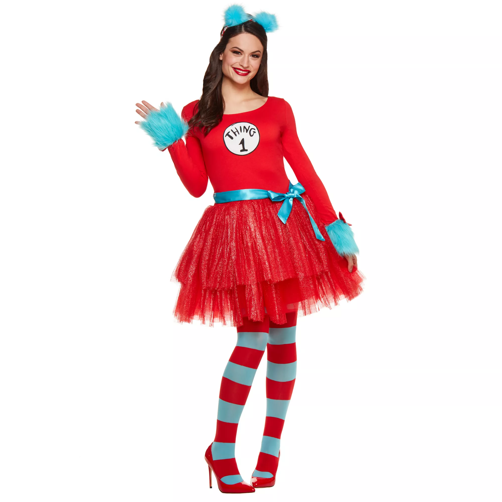 You'll be the cutest thing in the building this Halloween when you dress up in this Dr. Seuss tutu dress! The long sleeve red dress with attached glitter tutu will have you looking feminine and gorgeous all at once! Slap on your Thing patch, add your headband and tie up your belt! You'll be ready to join your crew for some happy Halloween-ing!