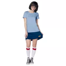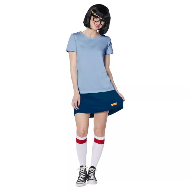 Become your favorite quirky character this Halloween when you dress up as Tina Belcher! This costume includes A blue skirt with official Bob's burger logo attached, a crewneck t shirt, Tina's signature glasses, an authentic wig and a hair clip! You'll look just like Tina for your next Halloween party!