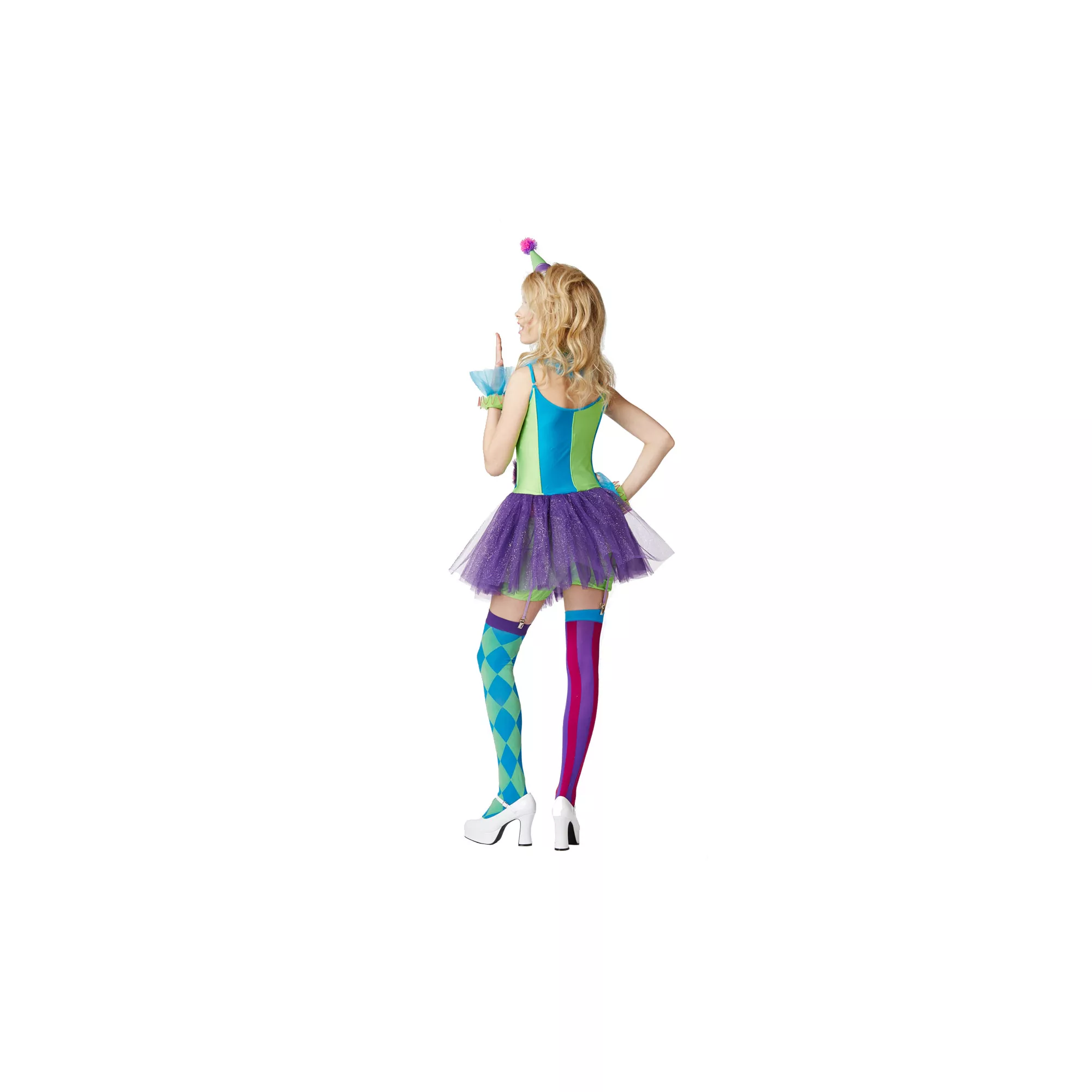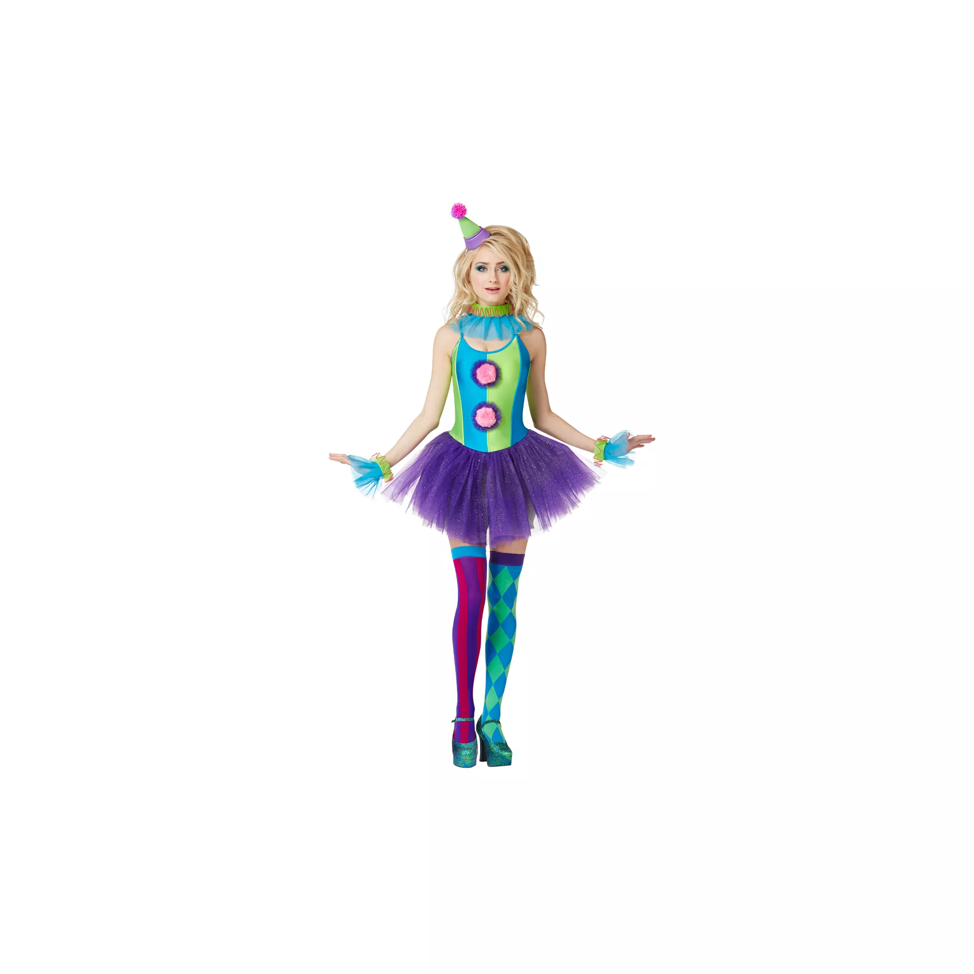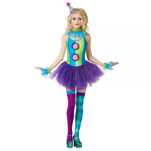 Announce your arrival this Halloween in Trixy the Clown Adult Women's Costume. This fun-loving clown wears a vibrant dress with purple tutu, tulle neck and wrist ruffles, a kooky hat and mismatched thigh highs.