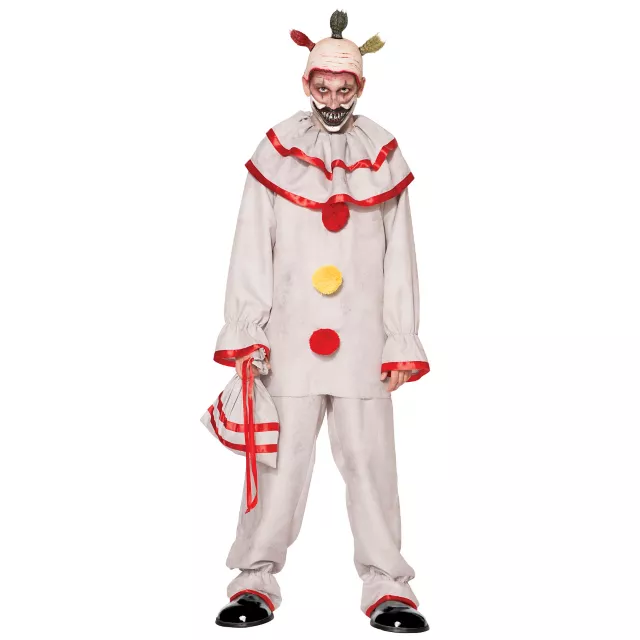 Relive your childhood nightmares this Halloween when you wear this officially licensed Adult Twisty The Clown Costume. While you might appear like a normal clown with the large ruffled collar and poms on the chest, your darker side will show with the Twisty mouth mask that covers his distorted face. Try your best to entertain all the kids this Halloween, and hopefully they'll appreciate you!
