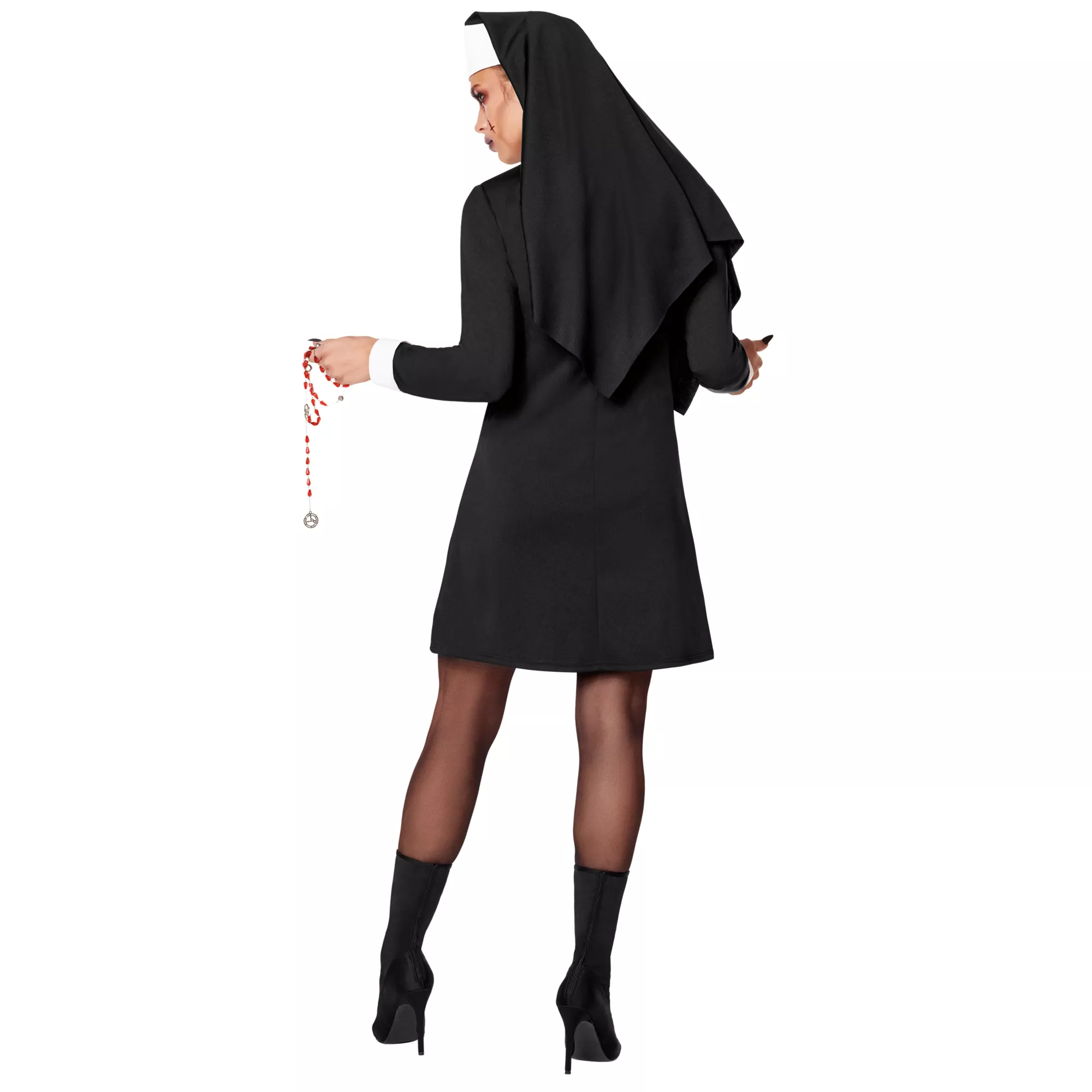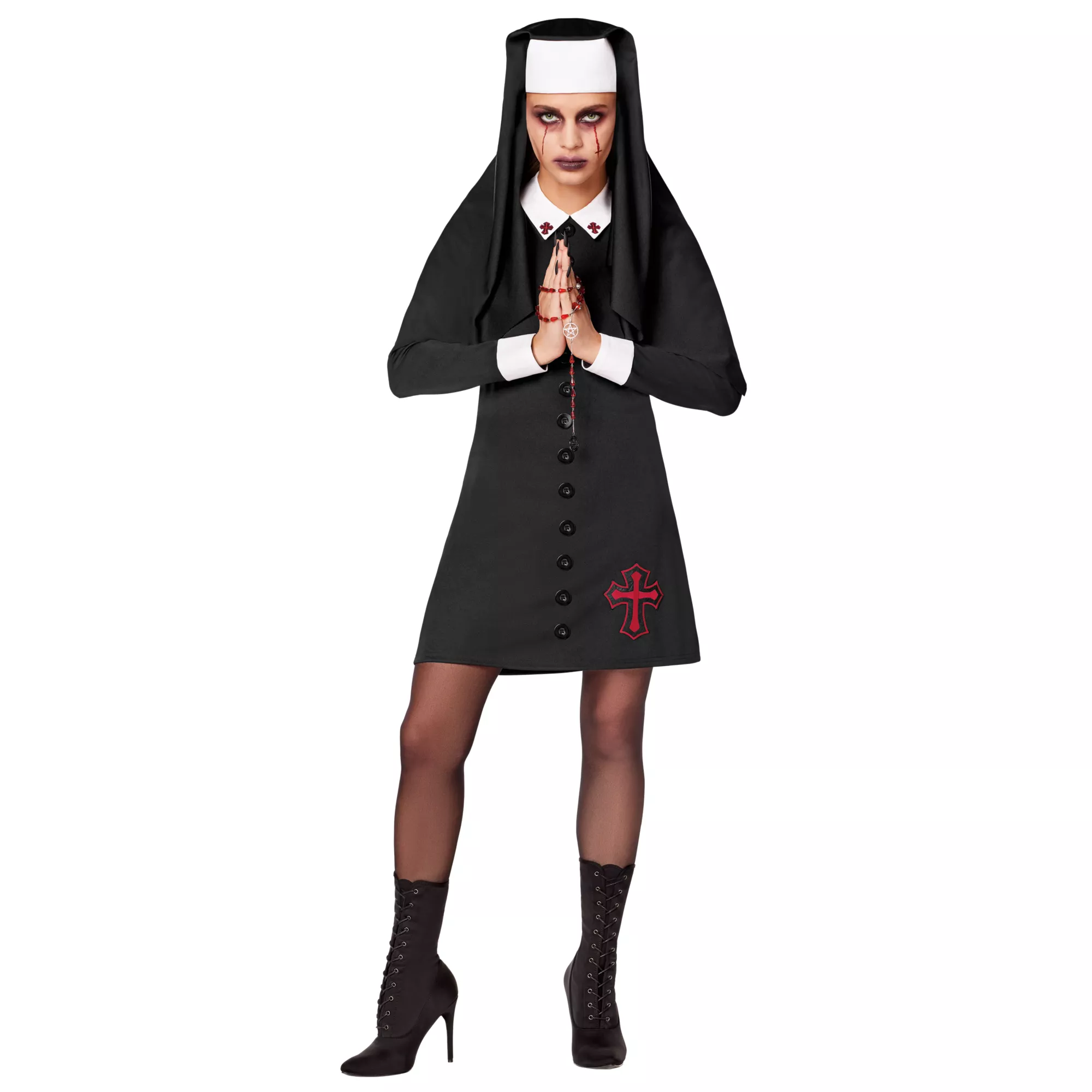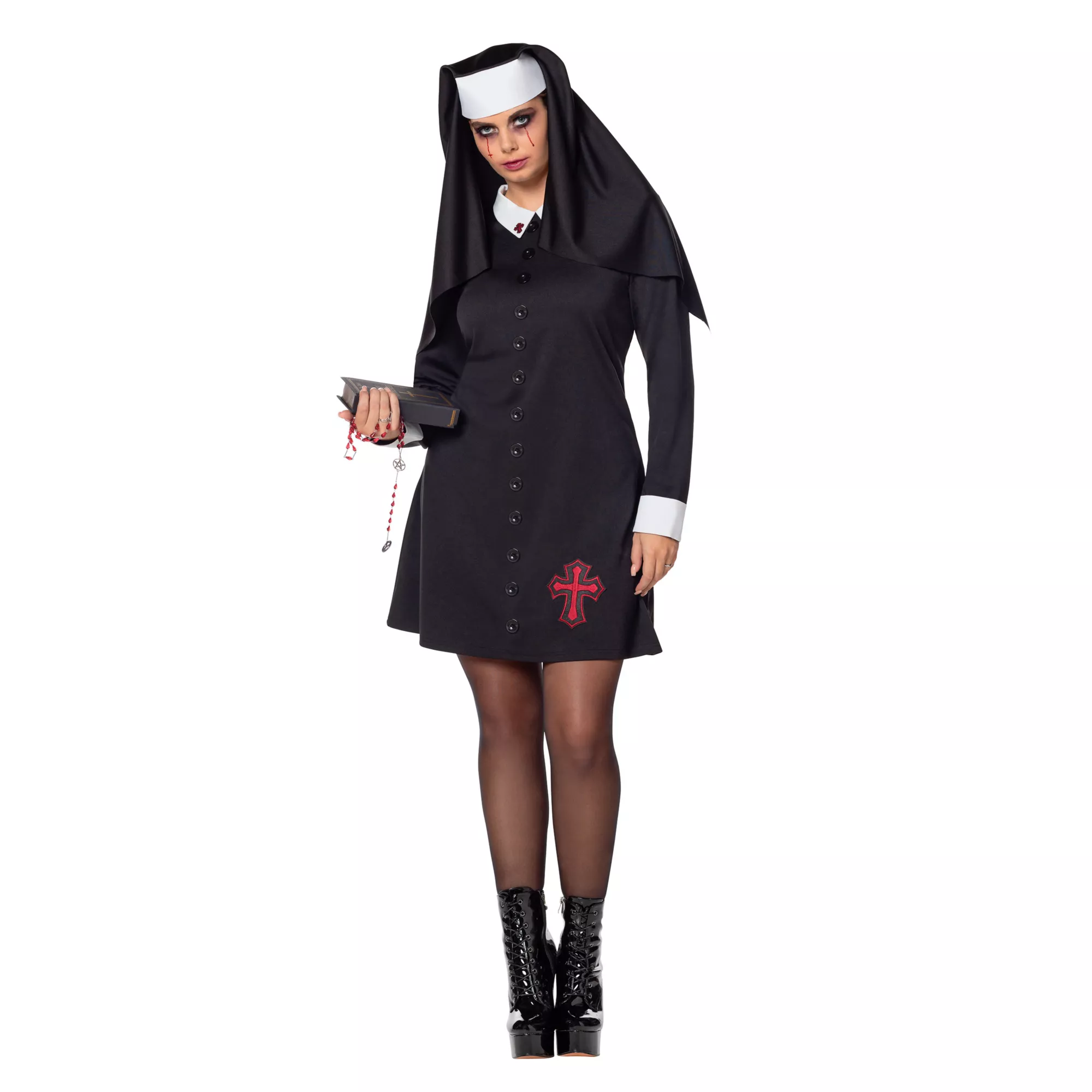 Make this Halloween unholy in this nun costume! This unholy nun costume includes a short black dress with long sleeves, decorative buttons, and cross accents on the collar and skirt. A black and white habit adds drama and authenticity to this dark look. Complete the sinister style with the included charm necklace.