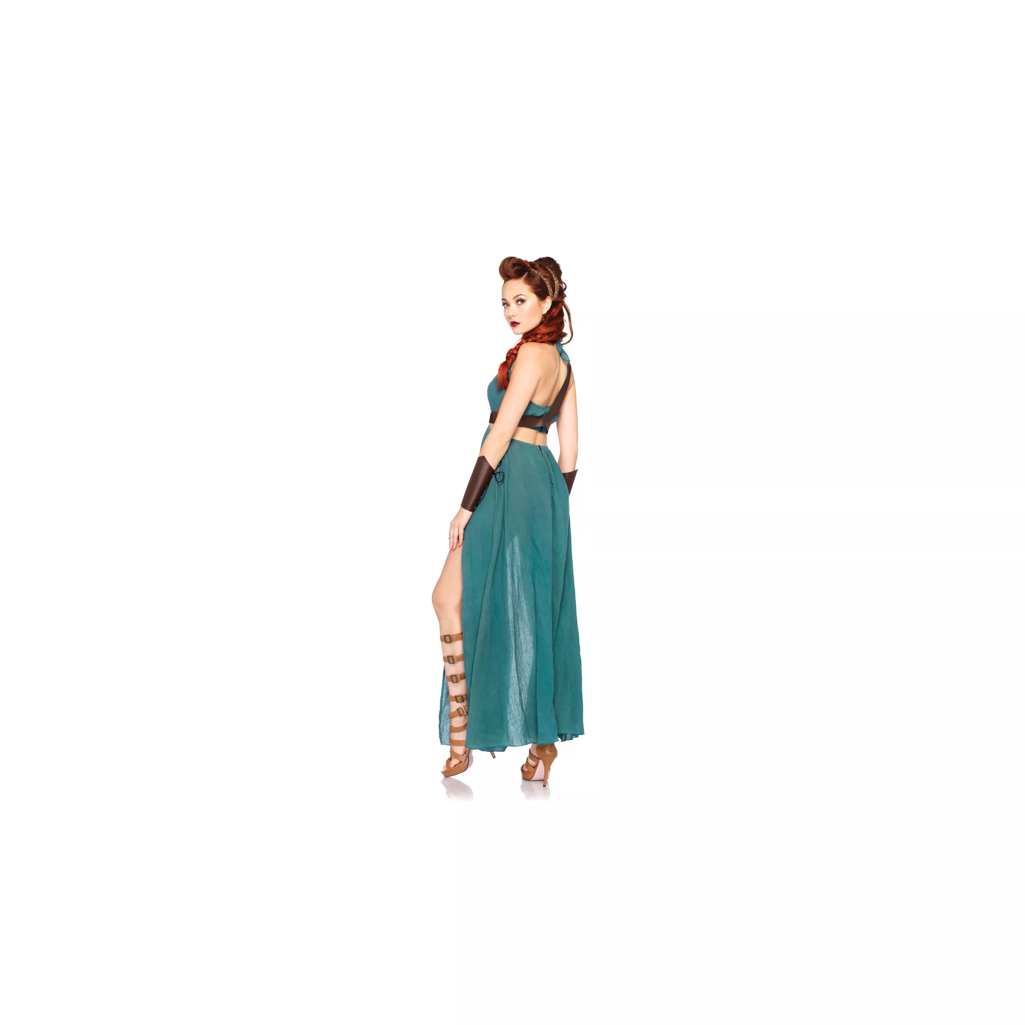 Fight off the enemy in the style when you wear this Warrior Maiden Adult Womens Costume. Beautiful green flowy gown comes with brown buckle shoulder harness, arm cuffs and braided headband. Flash them some leg and they'll be dead in their tracks!