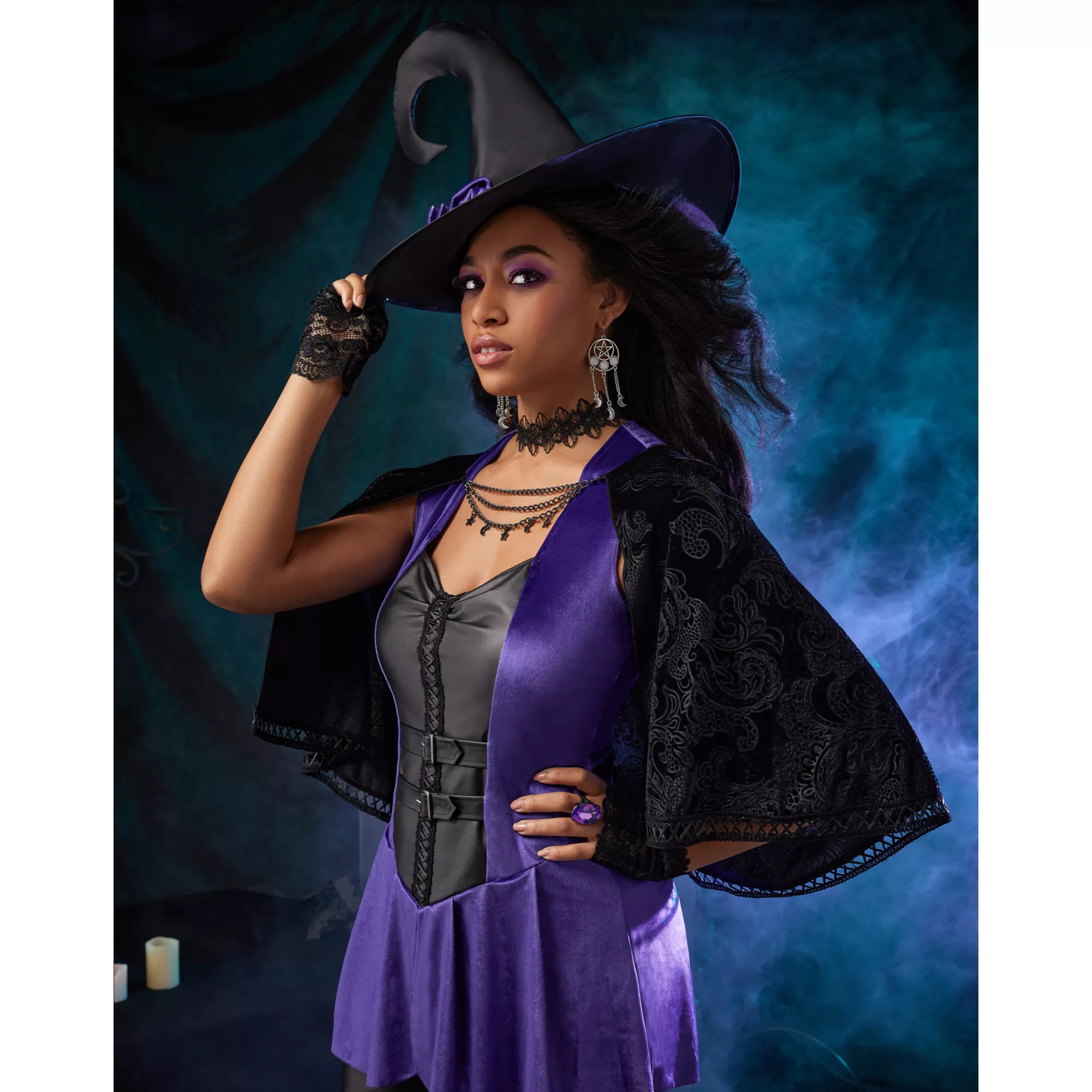 Look ready to brew up trouble when you put on this Wicked Spell Caster witch costume! With its attractive black and purple tunic, cape, pointy hat and leggings, this stylish witch look has everything you need to be totally bewitching.