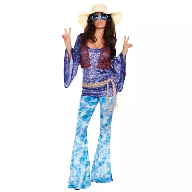Keep things groovy all night long when you hit the town in this Wild at Woodstock costume! Relive the good days and dance all day in these psychedelic blue and purple top, each featuring a soft, flowing style that hangs from your arms and ankles. The included red vest and accessories help complete the look, making it perfect for any grown-up wild child who wants to travel back in time for a few hours.