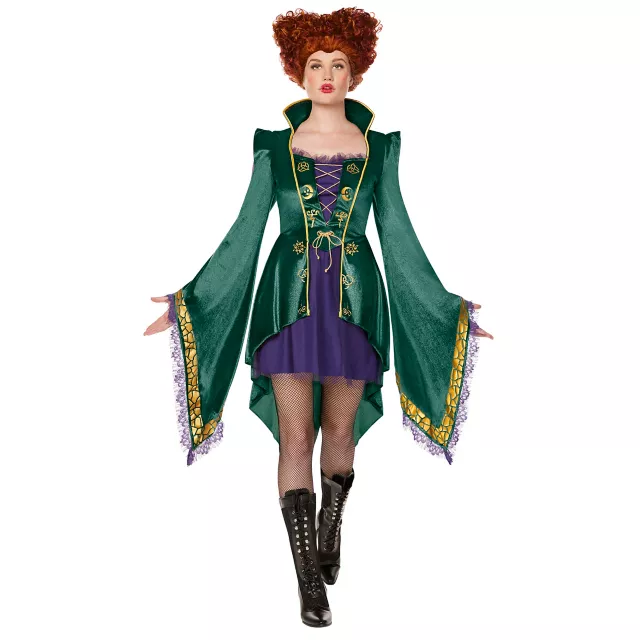 All the way from Salem comes this officially licensed Winifred Sanderson Dress, featured in Disney’s Hocus Pocus! This devilish dress displays brilliantly colored green and purple fabric adorned with gold detailing that only a real witch could pull off! Grab your bewitching sisters and get ready for an enchanting night of fright! Take a walk on the wicked side with this vexing villainess’s dress, available exclusively at Spirit Halloween.
