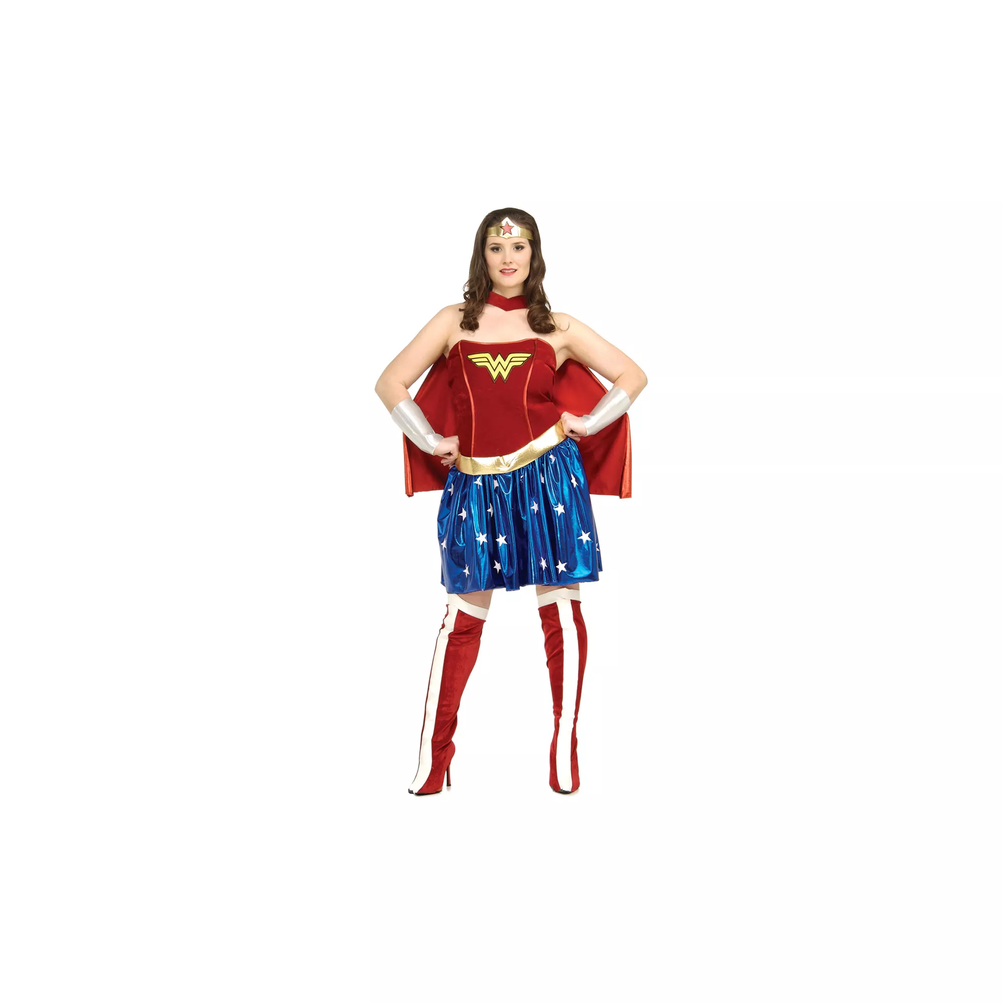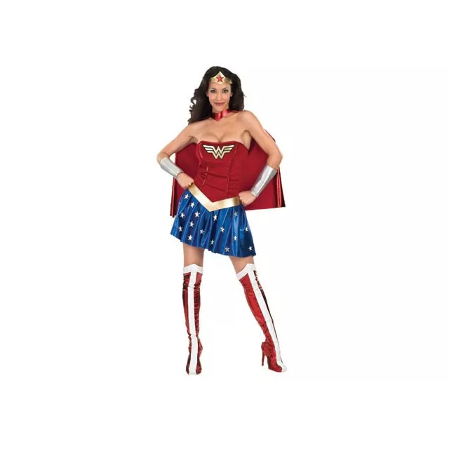 Celebrate DC Comics superheroine and fight crime in this officially licensed Wonder Woman adult womens costume. This sexy womens outfit is a red, white and blue, polyester/spandex blend dress comes complete with a matching red cape, boot covers, golden tiara and silvery gauntlets.