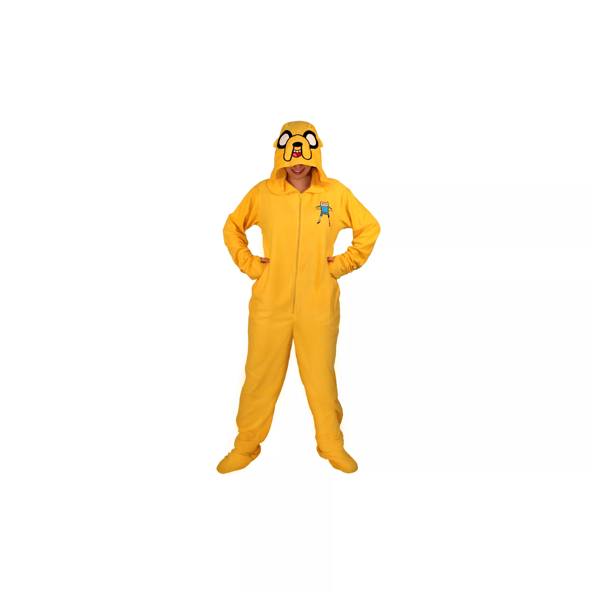 Make bed time a radi-cool time when you wear these officially licensed Adventure Time Jake Adult Pajamas. With removable feet, there's no excuse to not be comfortable in these zipper front, hooded pajamas.