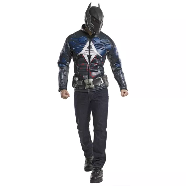 The Arkham Knight is ready to take down Batman in this officially licensed Arkham Knight Muscle Chest Costume! Features muscle chest top with blue and back background design on the top, red and black background design on the lower torso, and with the white "A" logo of the Arkham Asylum on the vent of the chest. Also includes belt with pockets to go around the waist of top and black mouthless mask!