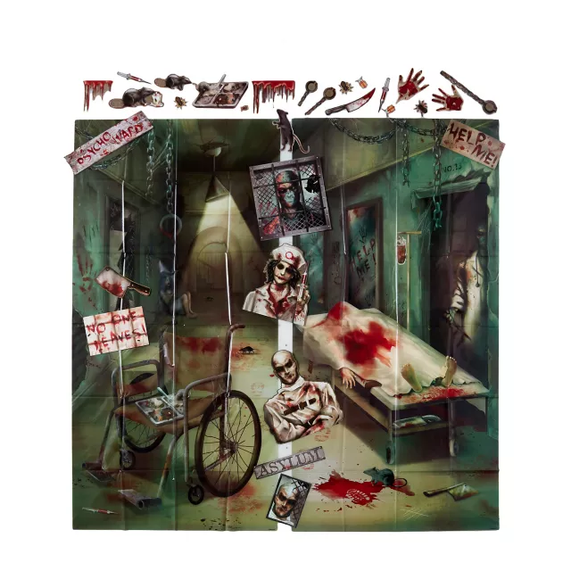 Everyone is going to go crazy when they walk into your bloody home as you decorate using this Asylum Wall Kit! These dilapidated asylum graphic sheets hang on your walls as you accent it with blood covered hand and rat graphics. Perfect to freak out guests when they walk into your home! Dress as a asylum patient and it will bring the entire decor together!