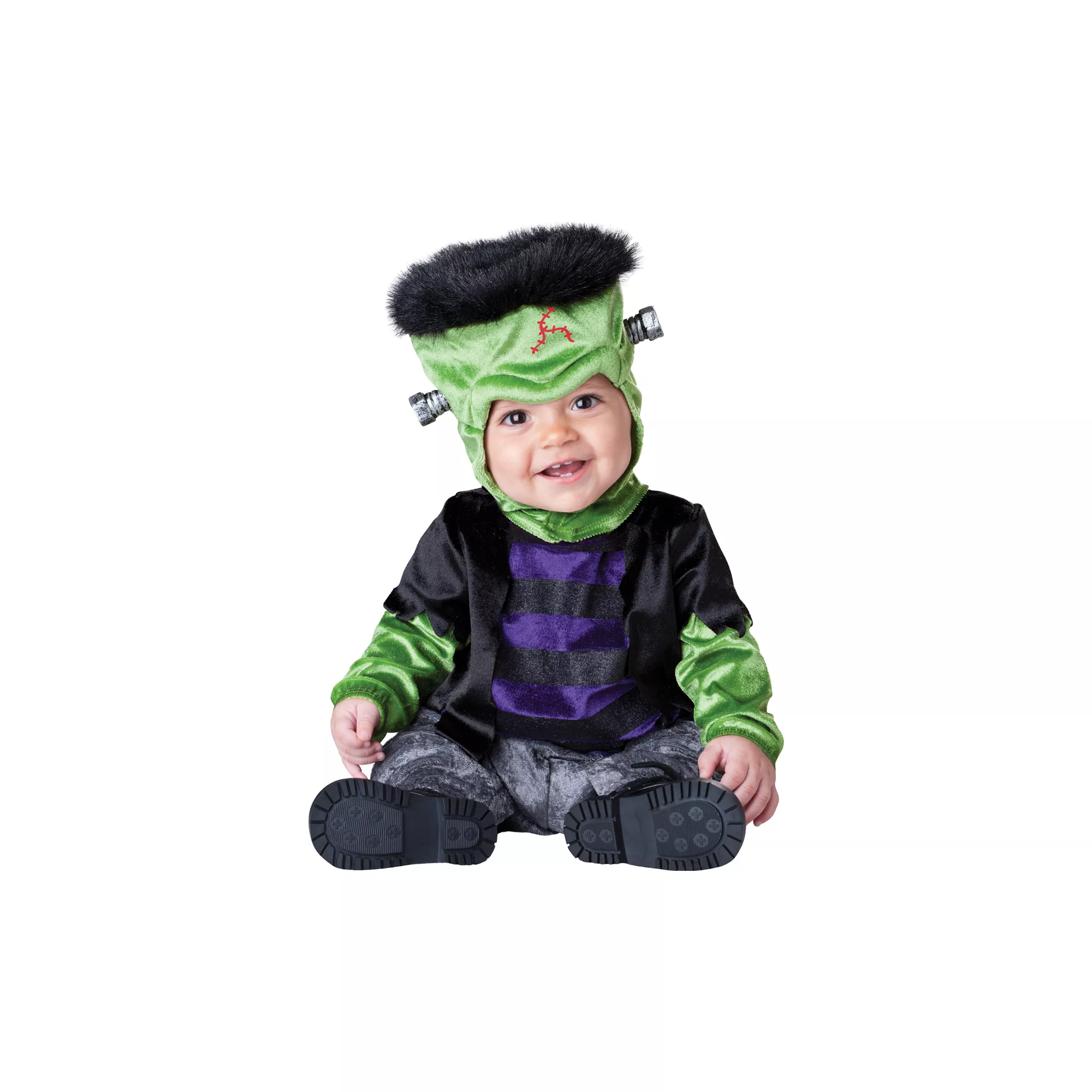 Your little monster will be cute as can be in this adorable infant's Monster Boo costume. The clever snap crotch jumpsuit makes for easy diaper changes; the hood features a plush tuft of hair, graphic scar and attached vinyl bolts.