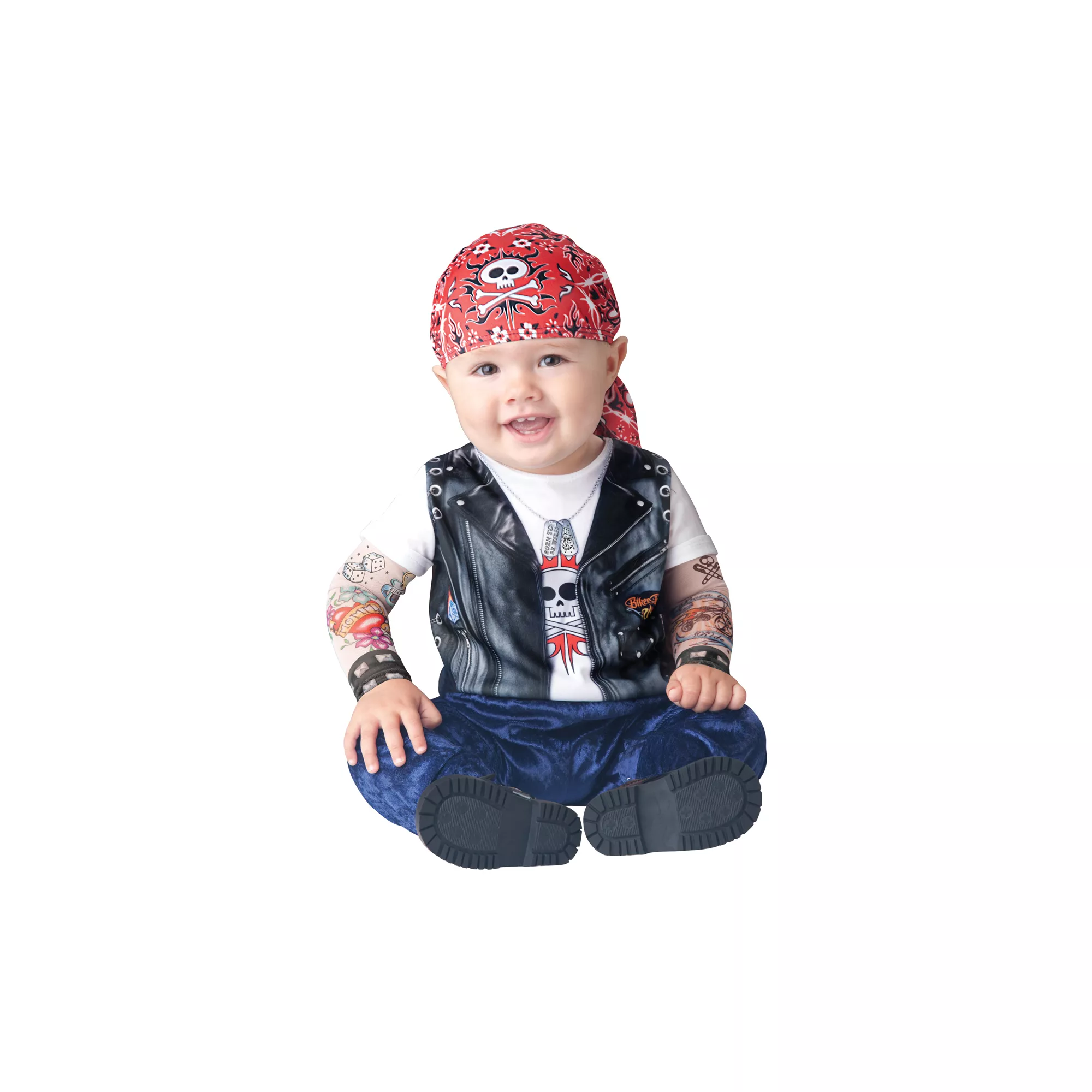 At least he'll grow out of this Born to Be Wild Baby Costume. Get all the bad out of his system when you dress him in bandana do-rag, jumpsuit with jacket print and tattoo sleeves and snaps for easy diaper change.