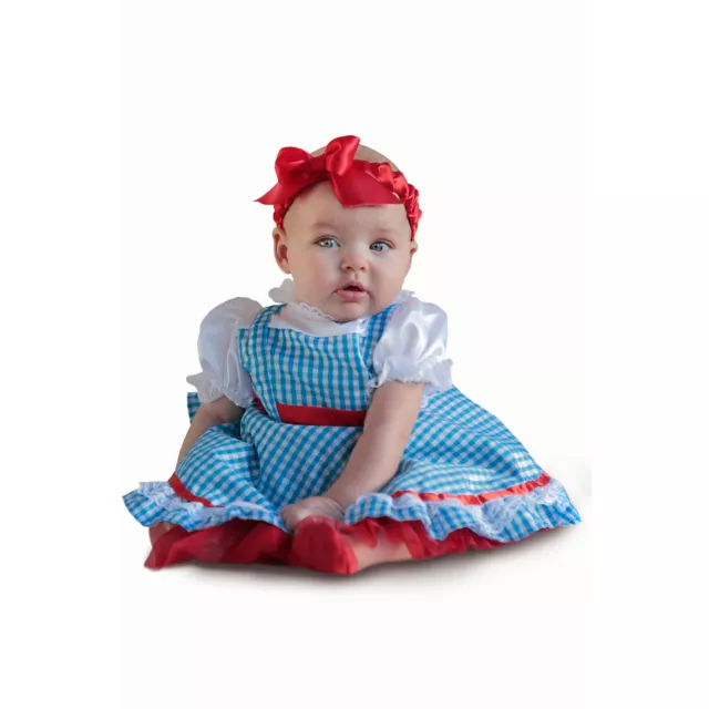There's no place like... Halloween to show your baby off as your favorite character in this officially licensed Wizard of Oz Dorothy Infant Costume! Dress your baby in this plaid dress featuring red ribbon and lace details as well as white puff sleeves, red ruffle diaper cover, and a silky bow headband. Let your little cutie click her sparkly shoe covers together as she squeals in glee in this adorable costume!