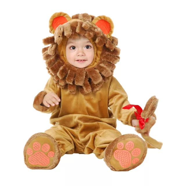 Your little one will be king of the jungle wearing this Little Lion Baby Costume complete with furry brown jumpsuit with little pink paw feet and lion's mane headpiece with ears. They'll feel like royalty on Halloween.