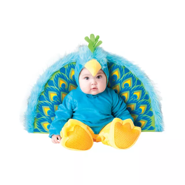 Display your little one in this Precious Peacock baby costume for a perfectly wonderful Halloween. The glorious plumage attracts all sorts of attention and the vibrant costume will pop in pictures. The blue, yellow and green lined zippered jumpsuit has a detachable tail and leg snaps for