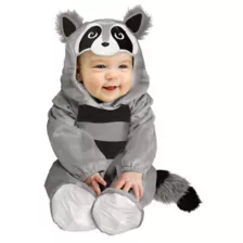 This Baby Raccoon Infant Costume is the perfect outfit for a nocturnal little boy or girl! They'll look adorable in this gray jumpsuit with black stripes on the tummy that match those on the fluffy tail. The hood features a little raccoon face and pointed plush ears. Just be careful - raccoons like to eat everything, including candy!