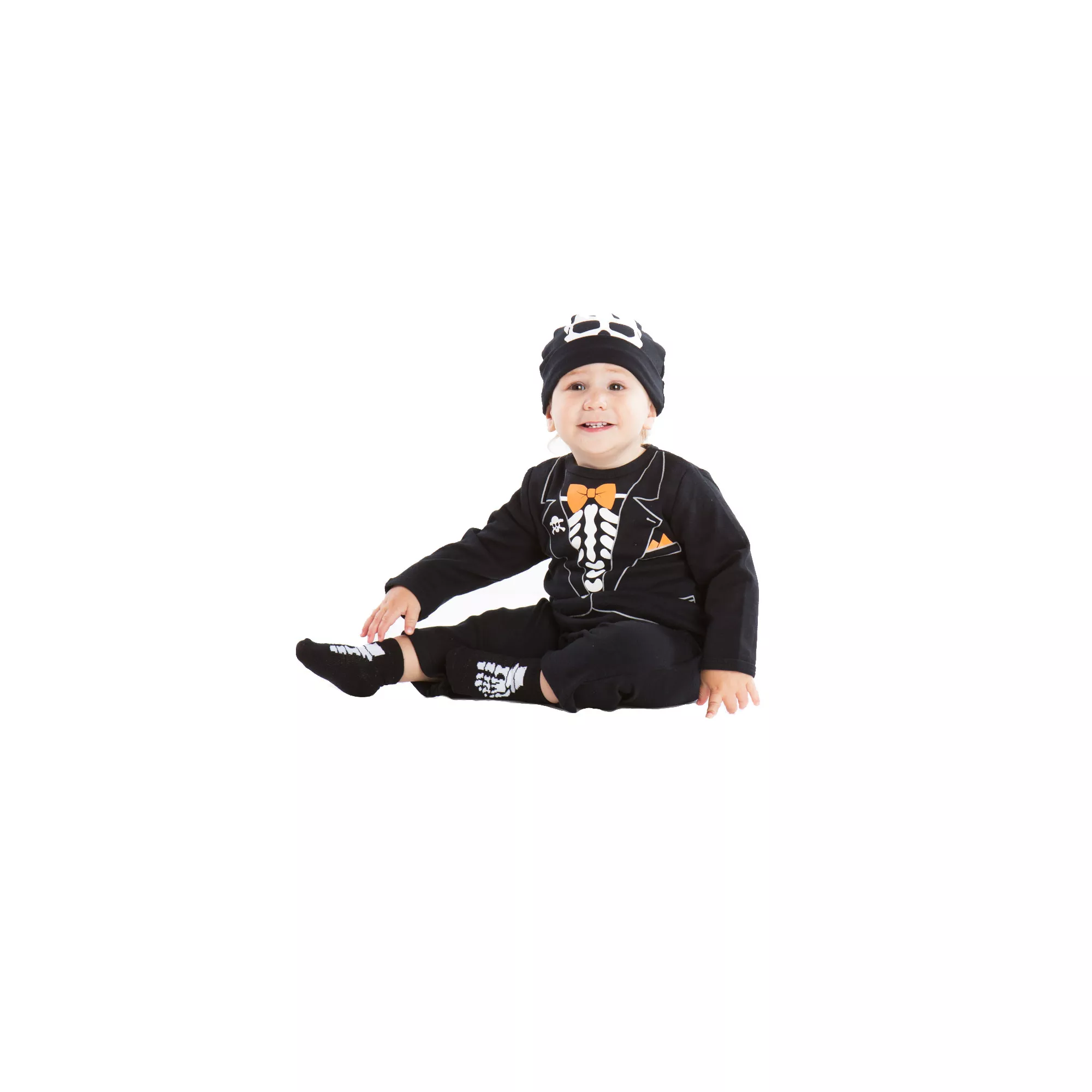 Dress your little bitsy baby in this Skeleton Tux Baby Costume complete with tuxedo over skeleton chest print and orange bow tie jumpsuit. Surprisingly cute skull hat and socks also included.