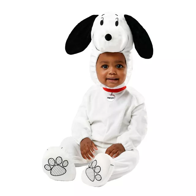 Dress your little one like Snoopy in this adorable Peanuts costume! This officially licensed costume includes a super-soft white jumpsuit with long sleeves, long pants, attached booties, a tail, and a dog collar adorned with Snoopy's name. Complete this huggable look with a detachable Snoopy hood!