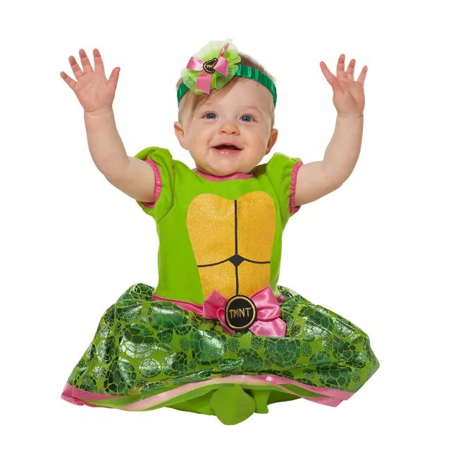 They'll be the cutest hero in the sewers this Halloween in this officially licensed Teenage Mutant Ninja Turtles costume! The super-cute set features a layered dress with turtle shell tulle and a glittering stomach panel complete with a shell on the back! Not to mention the embroidered TMNT headband and included green leggings that will have your baby ready to kick some butt.