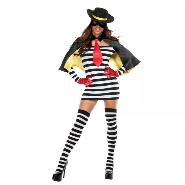Steal hearts as well as candy on Halloween when you dress yourself in this Bandit Babe Adult Women's Costume. Sexy black and white stripe form-fitting dress comes complete with hat, matching cape, black collar and red tie neck piece, eye mask and red gloves.