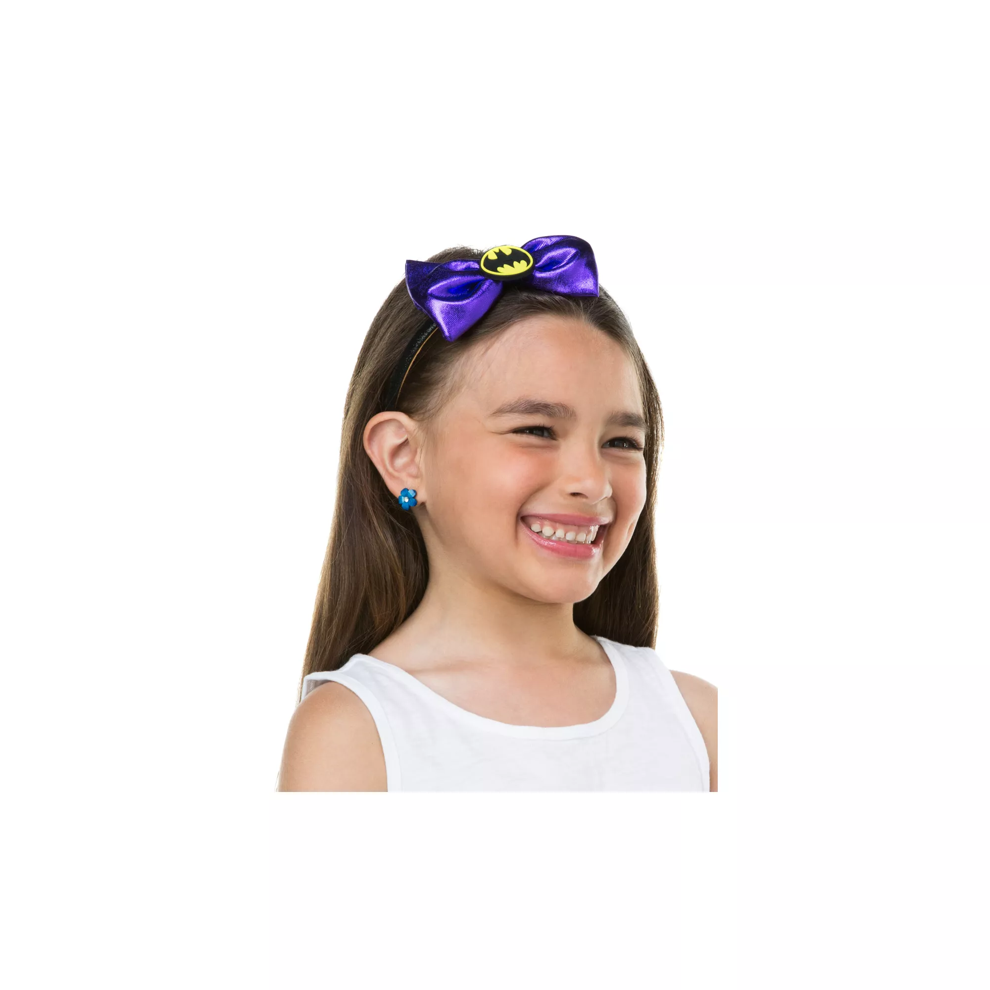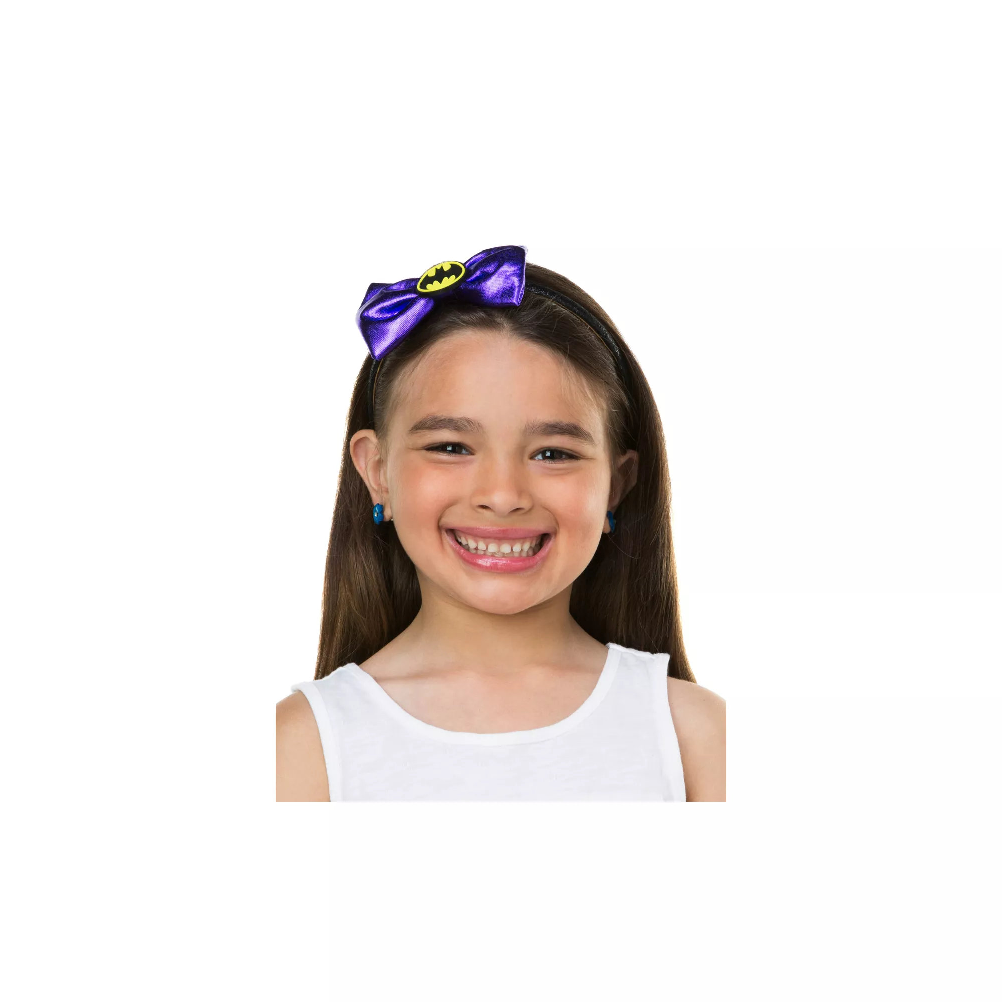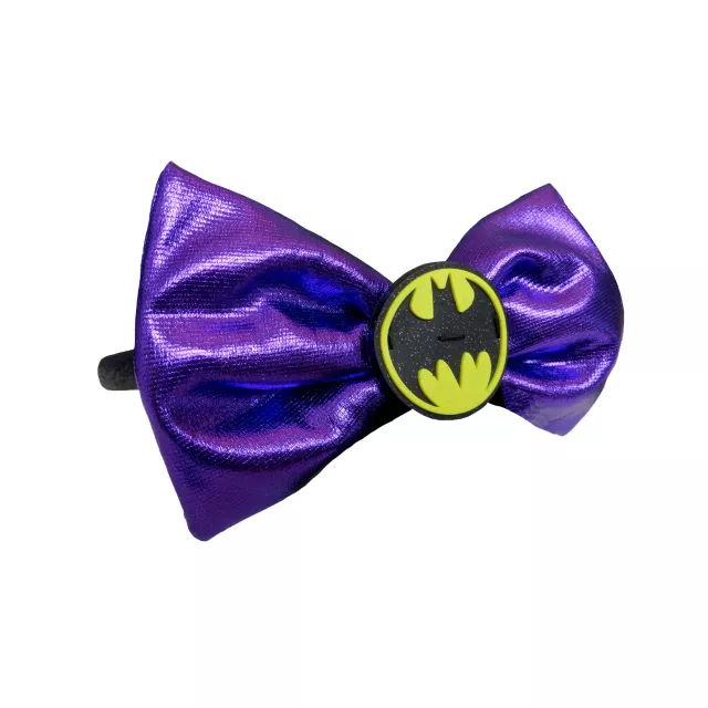 Shine all throughout the night in the Officially Licensed Batgirl Headband Bow. Features shiny, violet bow with yellow and black Batgirl emblem button.