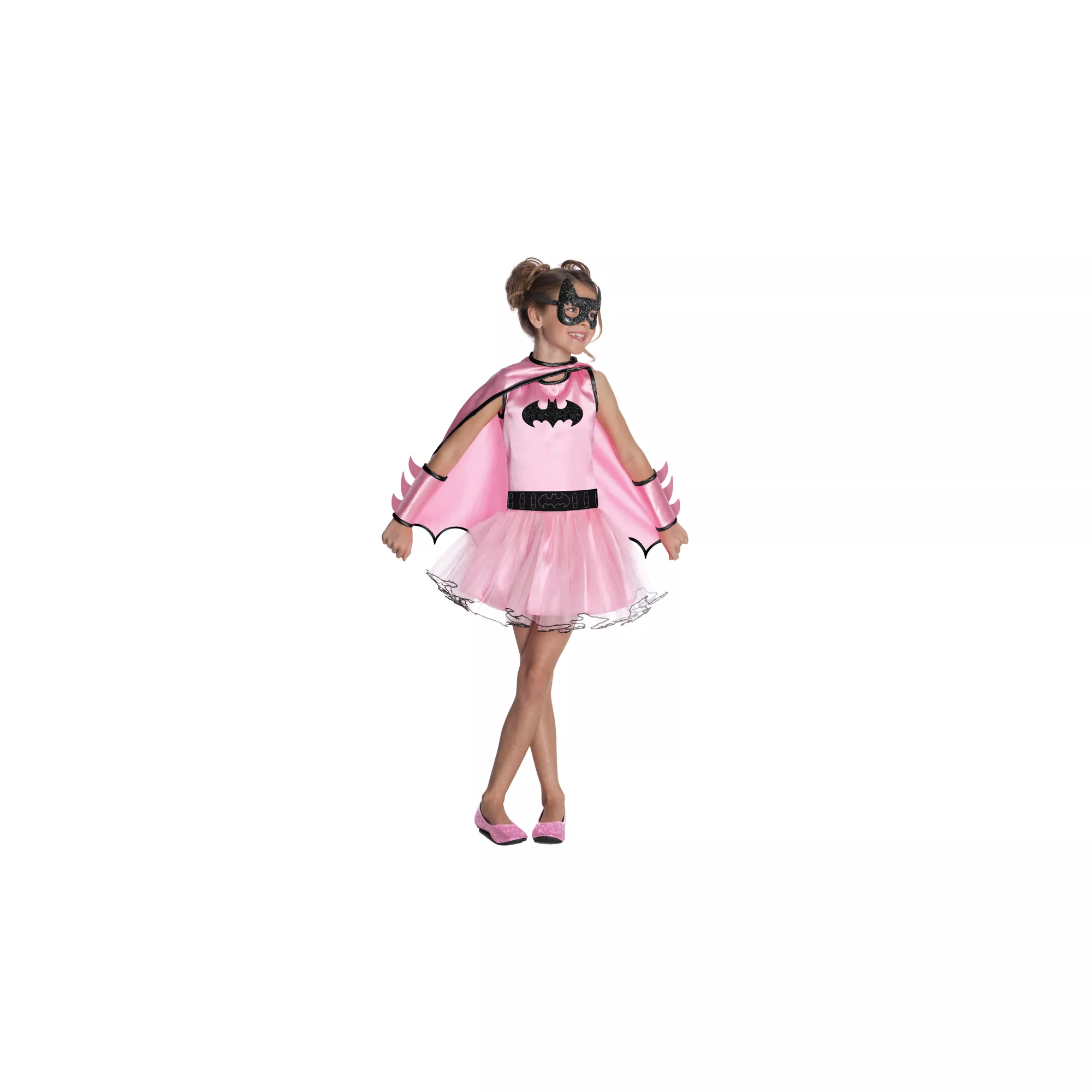Storm the party with your swiftness when you don this officially licensed Batgirl Pink Tutu girls costume. The pink tutu dress features a black Batman symbol and comes complete with a belt, cape, eye mask and gauntlets.