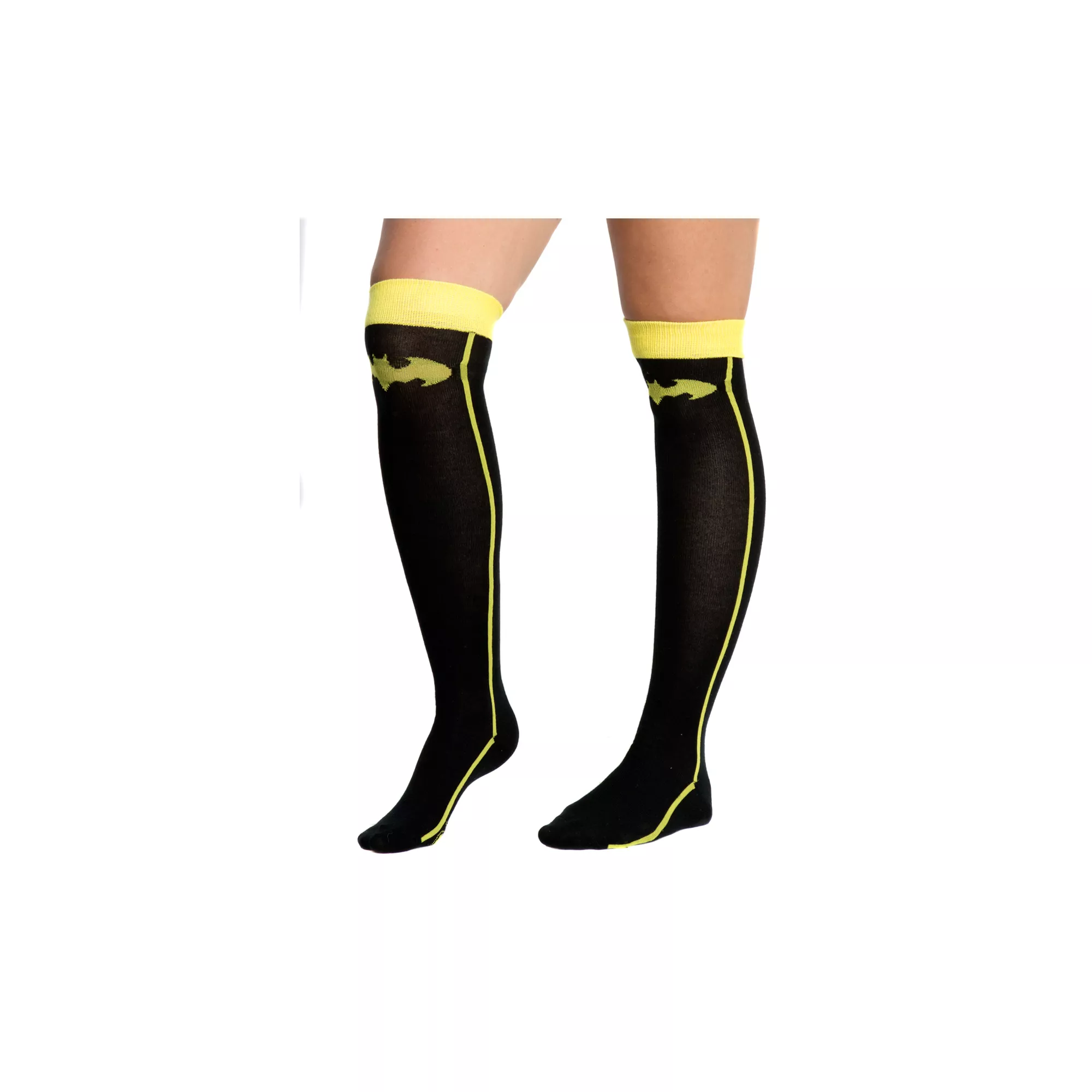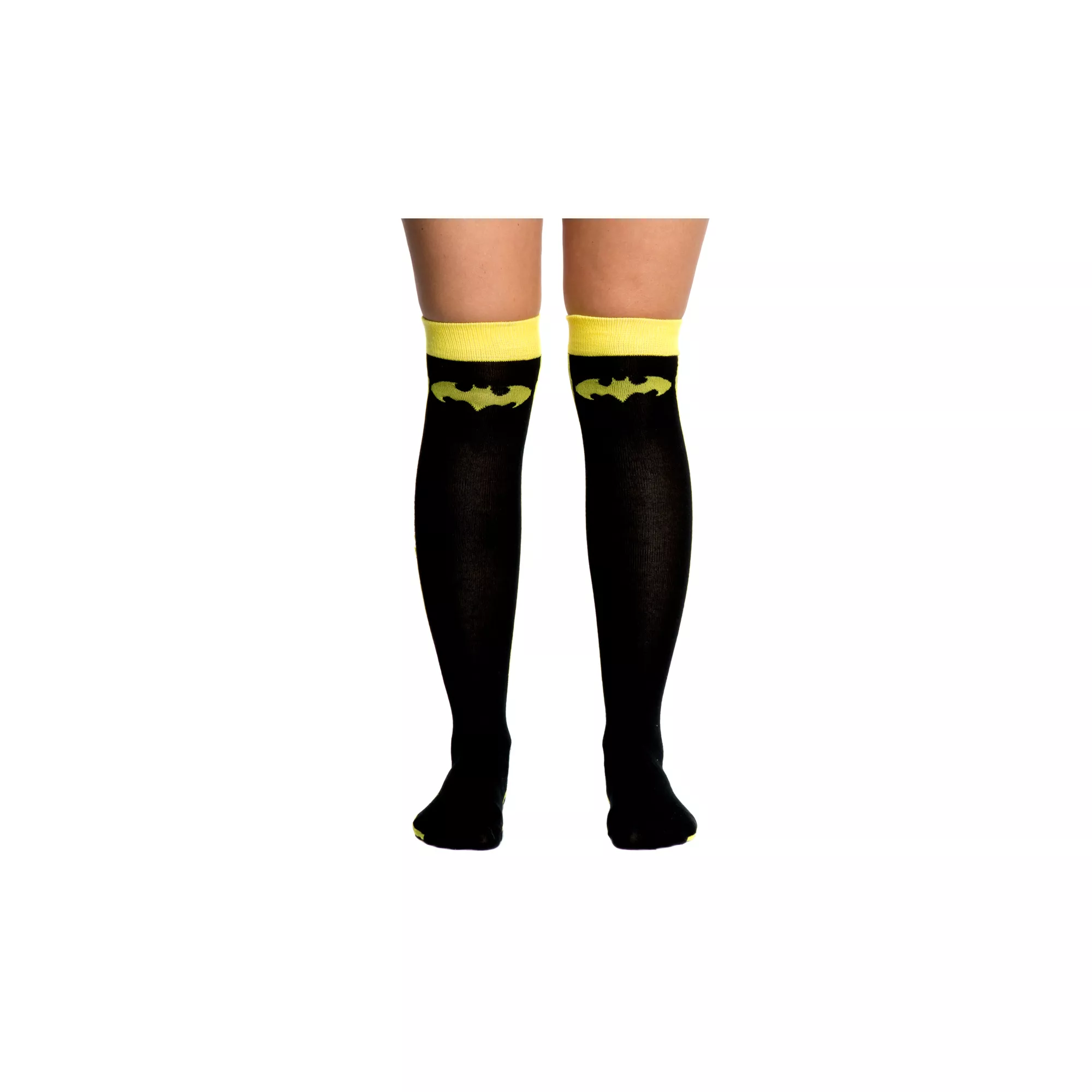 Save Gotham one step at a time when you wear these officially licensed Batman Over The Knee Socks! Black sock extends past the knee and features yellow detail including batman symbol, side pinstripe and hemline.