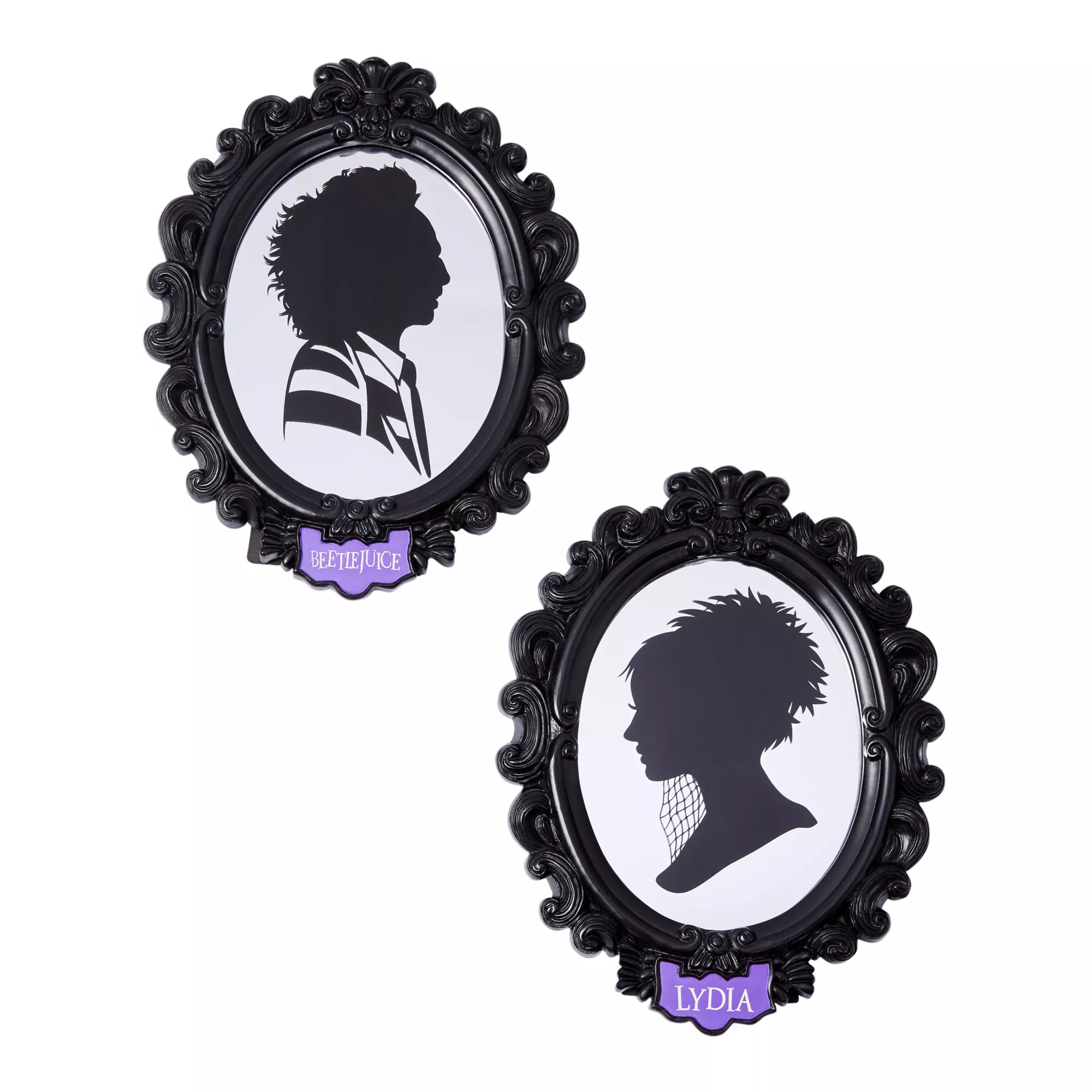 Show off your love of your favorite movie with this Beetlejuice Cameo 2 Pack Sign Set! These signs feature cameos of Beetlejuice and Lydia against a mirror background. They're the perfect Beetlejuice décor that you can put up year round.
