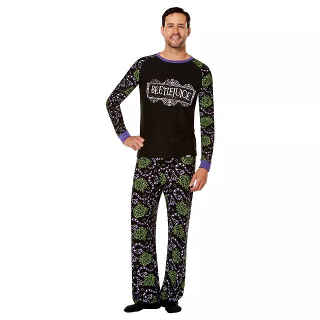 Snuggle up in ghoulish style with this Beetlejuice-inspired pajama set! This officially licensed pajama set includes a pajama shirt and pajama pants that resemble Beetlejuice's iconic pinstripe suit!