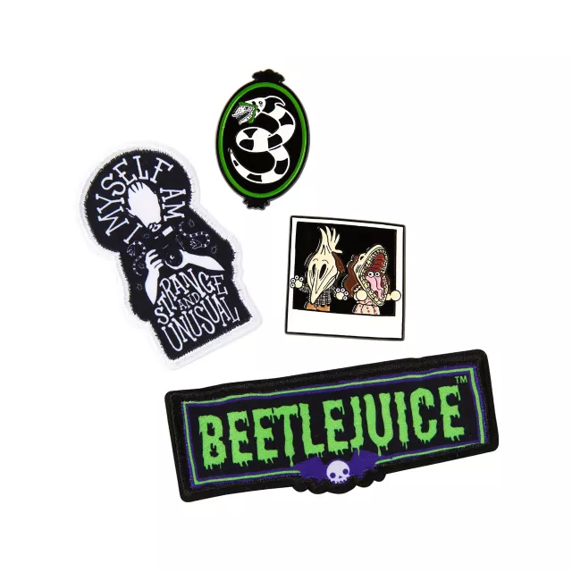 Enhance your Beetlejuice look with this patch and pin set! This officially licensed Beetlejuice patch and pin set includes a Beetlejuice logo patch, a "strange and unusual" patch, a sandworm pin, and an Adam and Barbara pin.