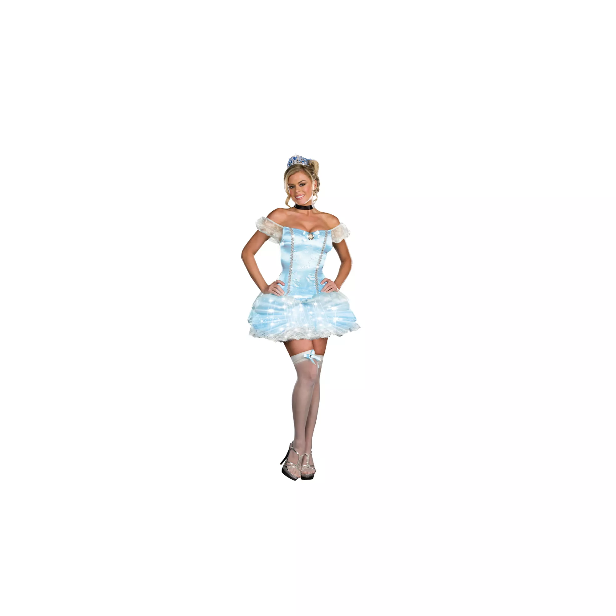 Make a little Halloween magic when you light up the room in this Bibbity Bobbity Boo adult womens costume. The stunning, pale blue and white dress comes complete with a light-up tiara, black neckband, two blue leg garters and two 3V lithium batteries.