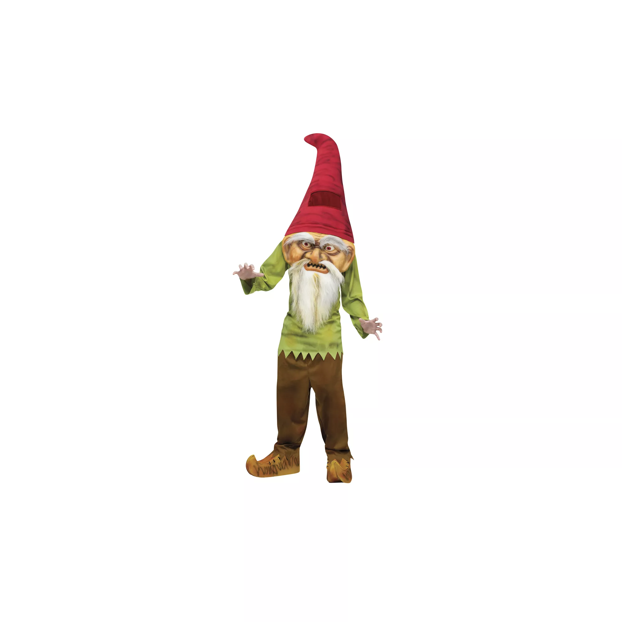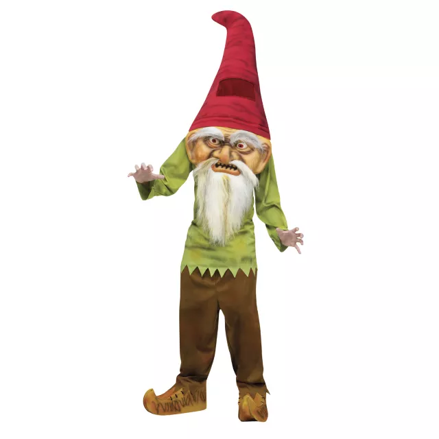 Add some extra spook to your Halloween when you wear this Big Head Evil Gnome child costume. The green top of this gnome costume features smudge accents, long sleeves and sawtooth cuffs and hem, complete with a pair of long brown pants, oversized gnome head with plush beard and shoe covers.