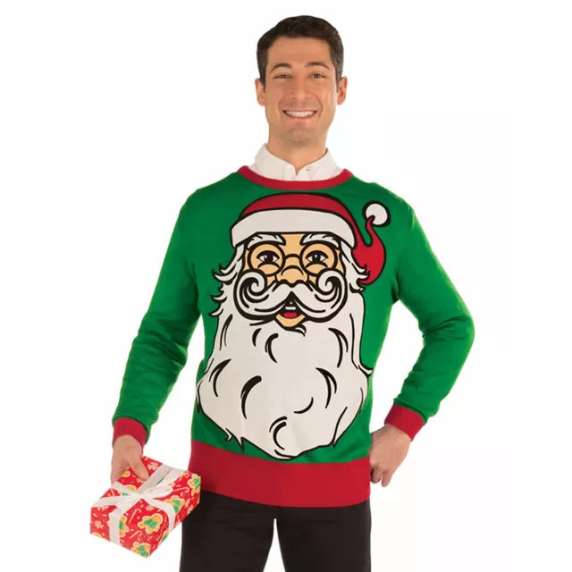 Get into the holiday spirit this Christmas when you wear this Big Santa Adult Sweater. This green acrylic sweater features red trim and a large Jolly Old Saint Nick graphic.