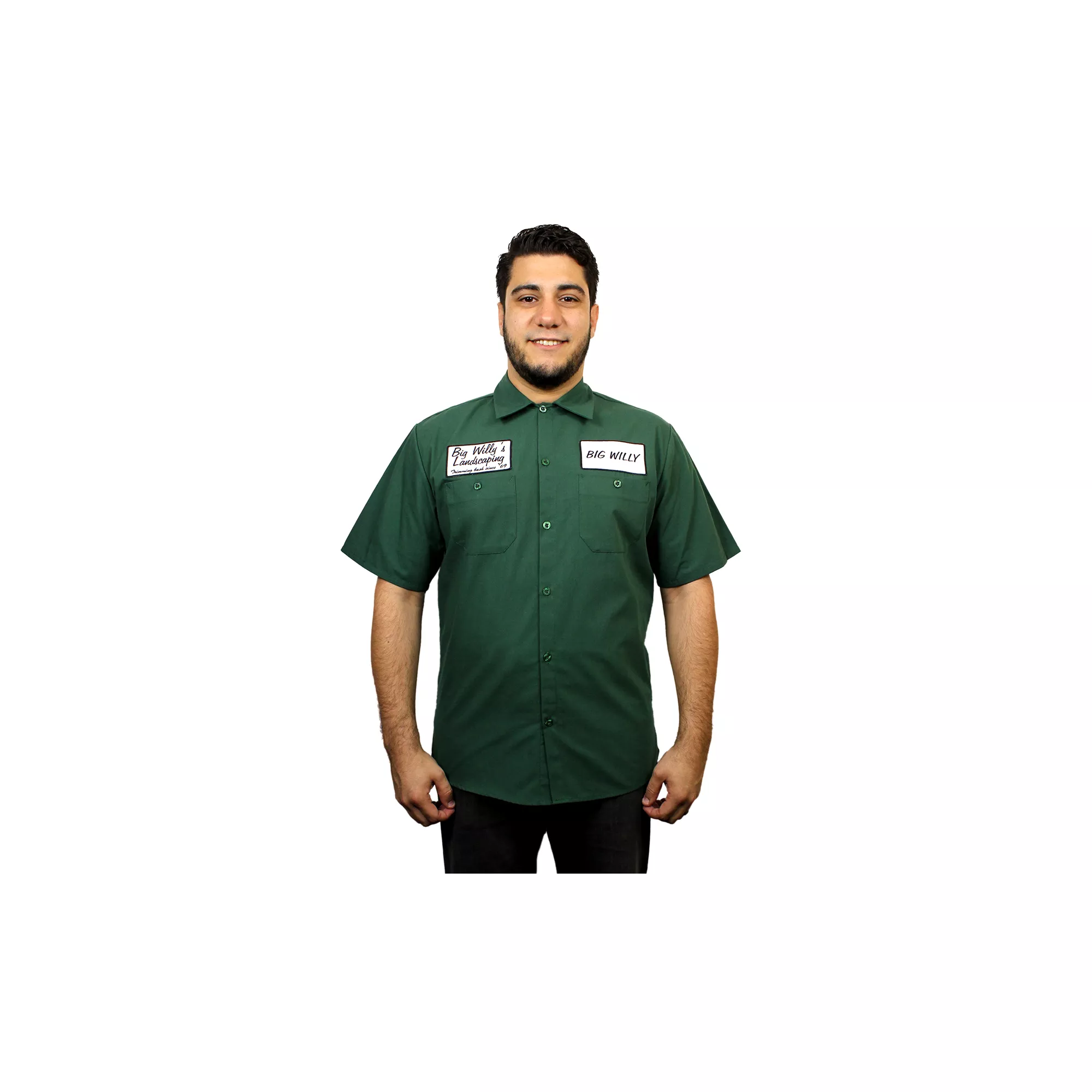 Get to workin' when you decide to wear this hilarious Big Willy's Landscaping Work Shirt. The green, button down shirt is a comfortable polyester/cotton blend that features a name tag and business patch, which each say "Big Willy" and "Big Willy's Landscaping, trimming bush since '69" respectively.